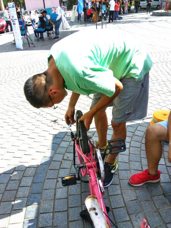 此次活动,从早上八点半一直持续到下午四点半。一大早,小绿的队员们就在小绿基地集合,将所需工具和零配件通过几次运送送到了三家村。随后,小绿队员们撑起了帐篷,挂起了横幅,摆放好工具箱,正式开始工作。义务维修一开始,就得到了许多老师、同学们的积极响应,纷纷推车来参与。引导组询问车况,并作相关记录,再交给维修组。维修组按照提示检修问题、松紧螺丝、更换部件……一步一步,有条不紊。碰上棘手的问题,就轮到熟练的老队员们边维修,边教学,新队员围成一圈仔细学习。炎热的天气也没能影响小绿队员们的工作热情。