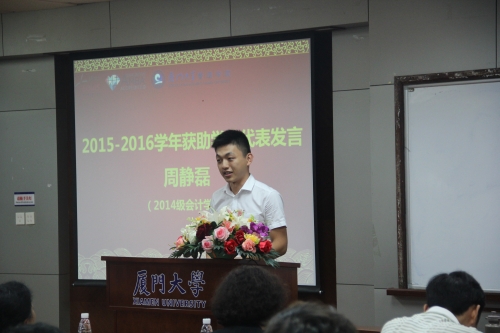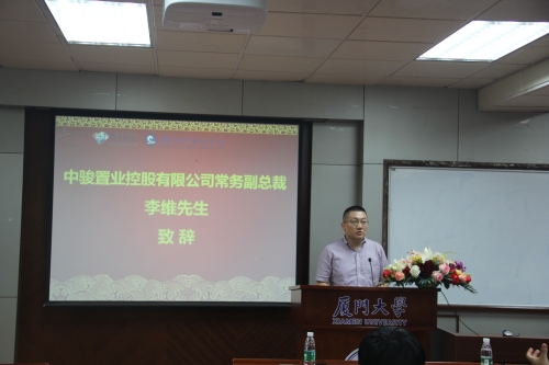 中骏置业控股有限公司常务副总裁李维先生在致辞中阐述了中骏集团在厦门大学管理学院设立助学金的目的,希望通过助学金的设立,能够减轻品学兼优、家庭贫困学生的经济压力,帮助同学们顺利完成学业;同时鼓励学子奋发学习,感恩社会,希望获助同学能再接再厉,早日成才,回馈社会;此外,他还就管理学院及母校厦大对中骏集团的支持表示了感谢。