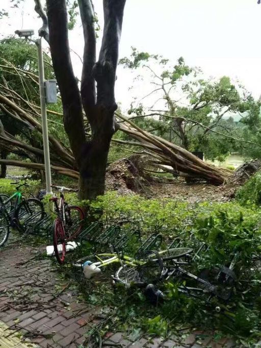 超强强台风”的“莫兰蒂”从厦门市翔安区登陆台风“莫兰蒂”绕过台湾,直冲闽南地区而来,登陆时最大风力达15级。狂风席卷而过,原本风景秀丽的厦门大学变得满目疮痍,深受厦大学子喜爱的公益自行车“小绿”也未能幸免。经过台风的肆虐,“小绿”随风飘移,有些被压在大树下扭曲变形,有些经过颠簸变得支离破碎,我校“小绿”受到严重损害。