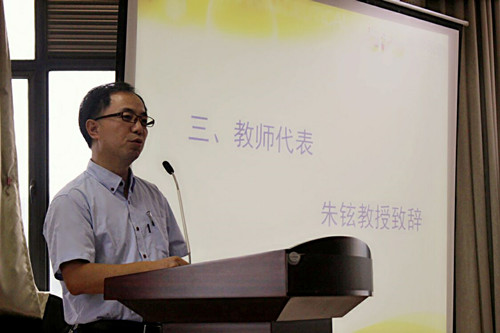 教师代表朱铉教授发言。朱教授鼓励新生们要珍惜美好大学时光,充分利用校园优越的资源,不断发展自己。朱教授提出,大学生要有无师自通、举一反三的能力;要学好专业知识,作为理论支撑;要从兴趣出发,主动参与到大学生创新创业当中;要发挥正能量,拥有积极、严谨的态度;要努力成为心智成熟、人格健全,从自然人向社会人的转变。