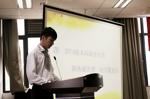 2016级本科生阿布都瓦里·吐尔夏作为新生代表上台发言。他首先表达了对大学生活的美好憧憬。他回忆了军训时的努力拼搏,他相信军训的洗礼让同学们更加坚强,使他们更有信心去面对之后的风雨。