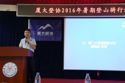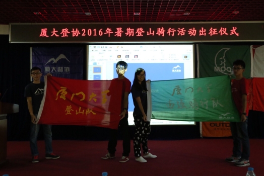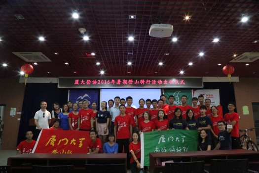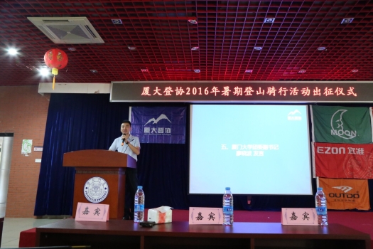 2016年7月21日上午9:00,厦门大学登山协会在厦门大学自钦楼二楼多功能厅举行了2016年暑期系列活动出征仪式。出席本次出征仪式的有学校团委副书记廖晓波等相关领导老师、登山协会会员、媒体记者、赞助商代表等。