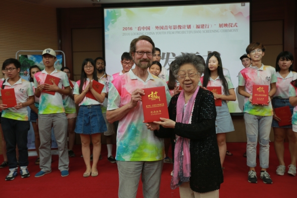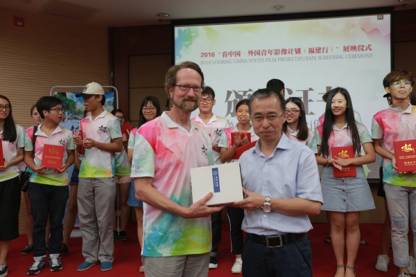 展映仪式最后,黄会林先生、Geoff Poister教授、阎立峰教授、苏俊斌副教授上台为“看中国·福建行”的中外方青年颁发了证书。此外,黄会林先生为外方指导老师Geoff Poister颁发证书,对他为“看中国”活动做出的贡献表示衷心感谢。