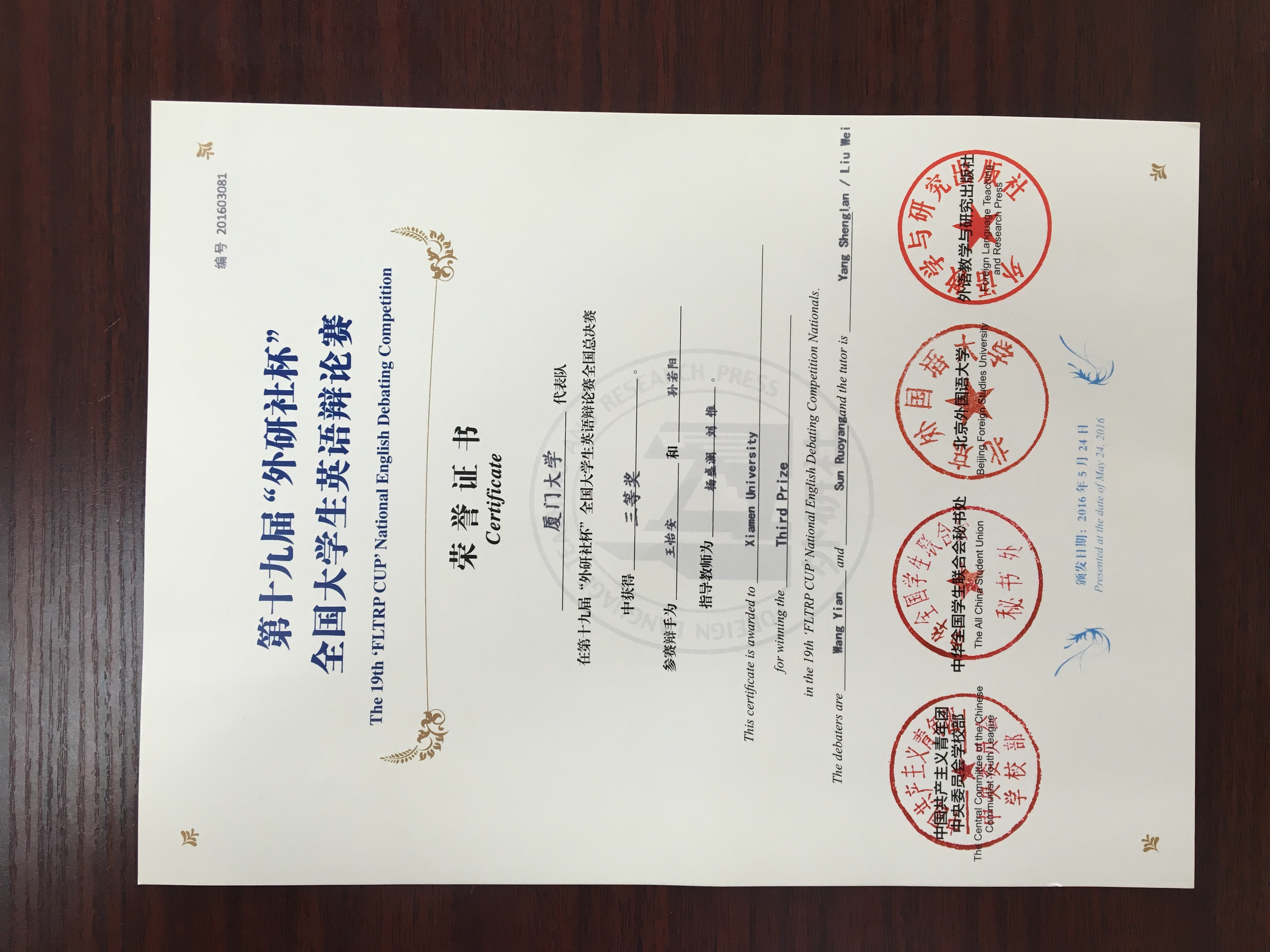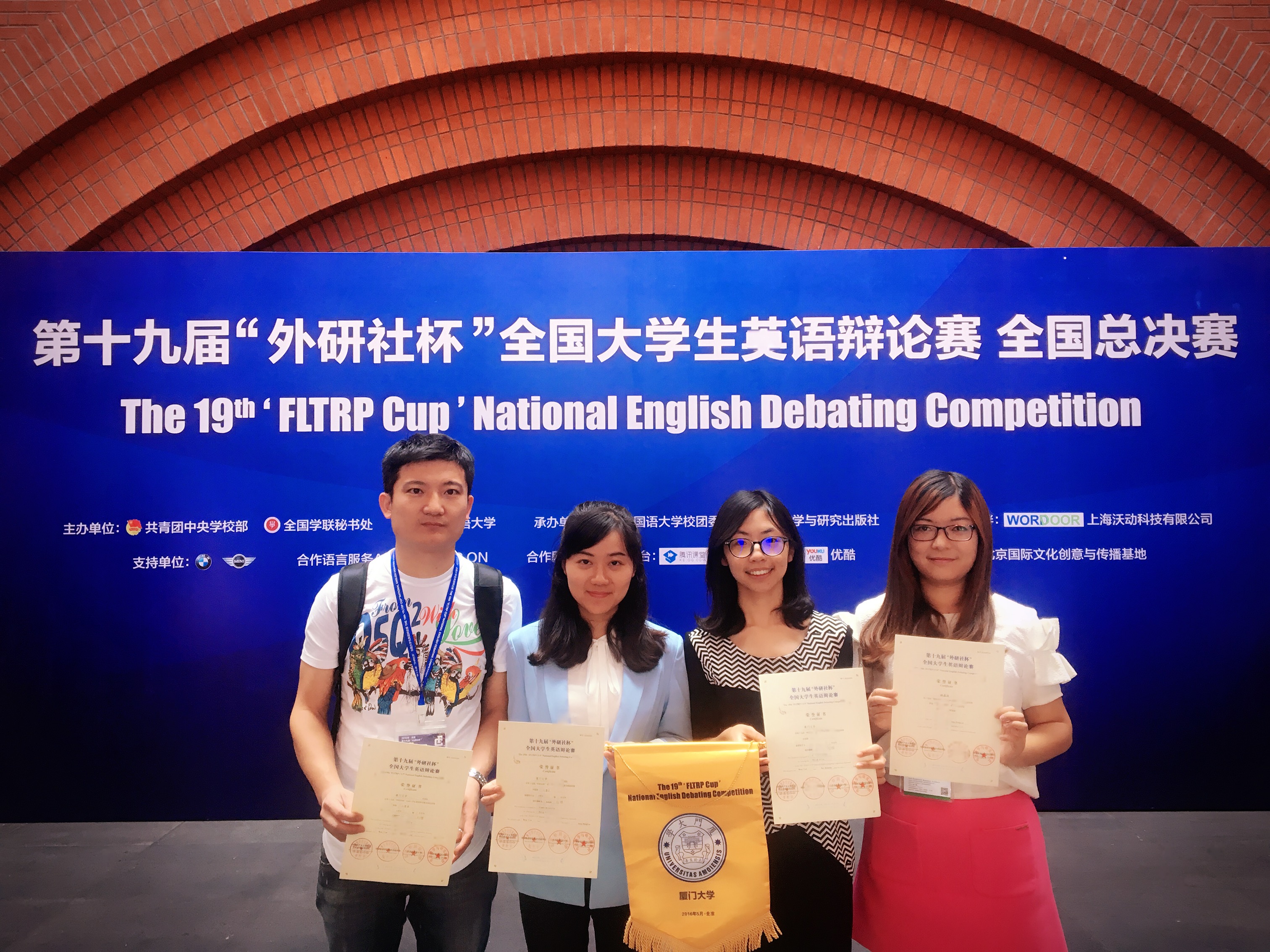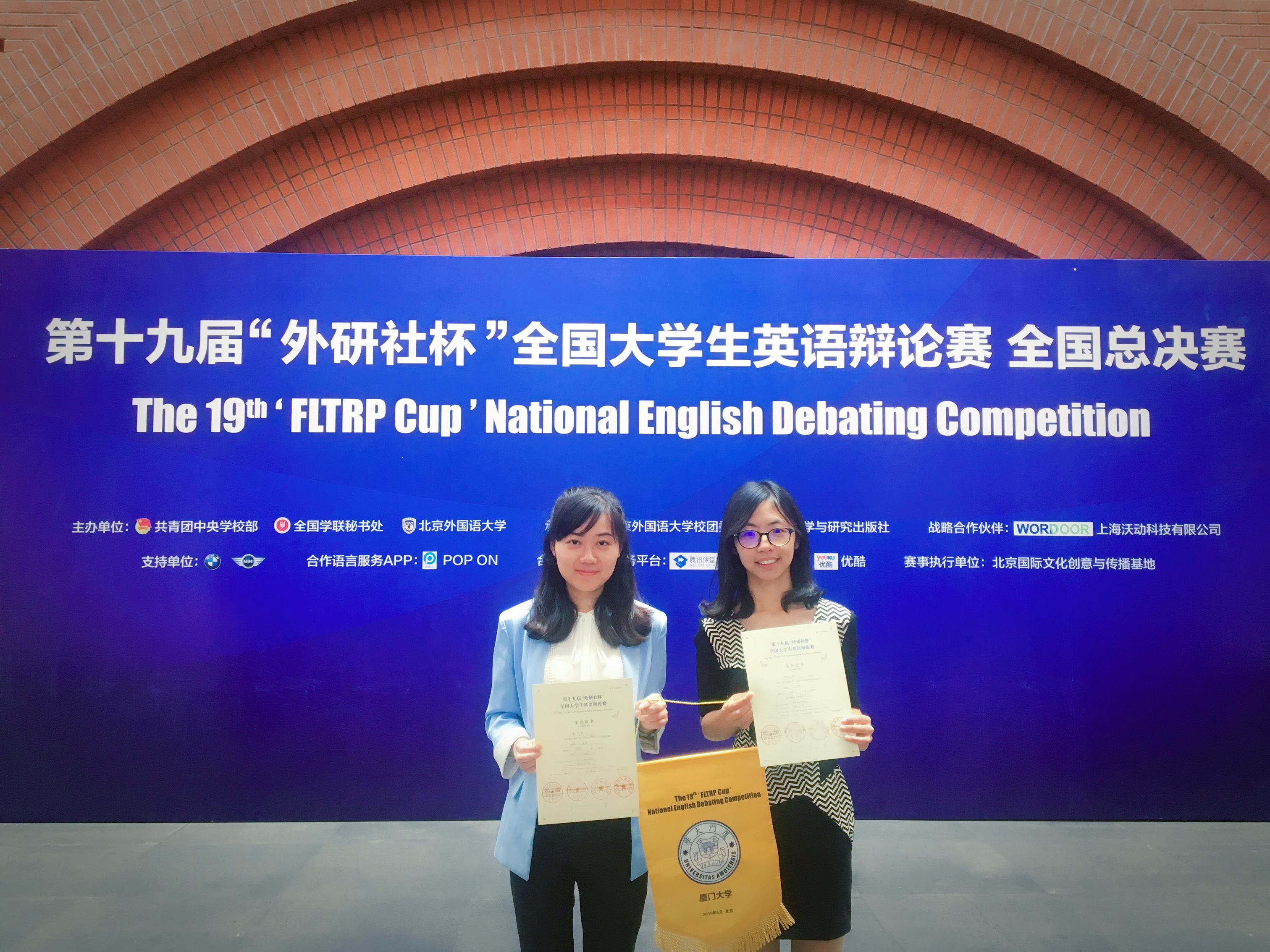 2016年5月18日至24日,第19届“外研社杯”全国大学生英语辩论赛全国总决赛在北京外国语大学隆重举行。由我校外文学院英语系口译方向2014级研究生王怡安同学和外文学院2015级本科生孙若阳同学组成的厦门大学代表队经过校选赛、地区赛的层层选拔,最终晋级全国总决赛,取得全国三等奖的好成绩。