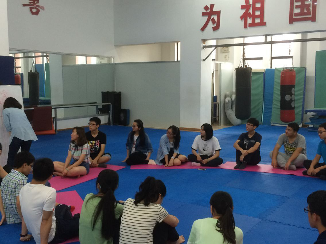 早晨8点半,天还下着小雨,但完全阻挡不了同学们的热情。搏击馆内已经聚集了十余位同学。九点活动正式开始,李颖老师先让所有同学围坐成一圈,让同学们先两两一组介绍自己以及对本次活动的期待。之后小组变为四人、八人、并扩张到所有人。李颖老师在不知不觉中让同学们都熟络了起来,消除了一开始的紧张感。