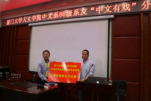 分享会上,86级中文系班长单士勇校友代表全班同学向中文系捐赠人民币15万元,王炳华书记代表人文学院中文系接受捐赠,并对校友们的慷慨之举表示衷心感谢。此项捐赠将纳入中文系“鼓浪励学金”基金,“鼓浪励学金”是95周年校庆期间由中文系各级校友共同发起的一项奖励基金,拟用于支持人文学院教育事业发展,奖励中文系在创新、创作、创业、访学交流、志愿服务等方面表现优秀的学生。在中文系各级校友的积极组织和踊跃捐赠下,目前“鼓浪励学金”筹集金额已达70余万元,加上配套基金总额近150万元。