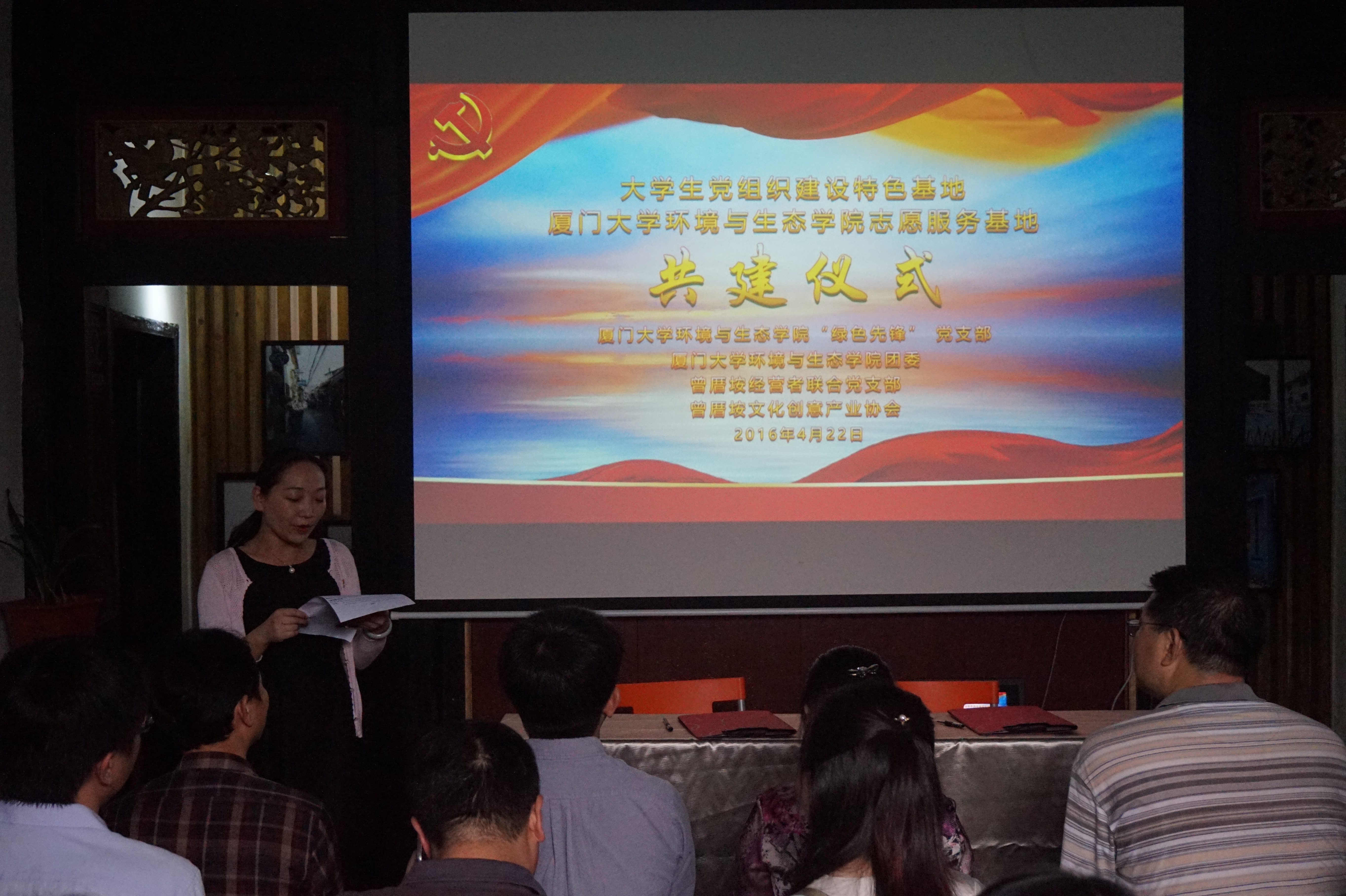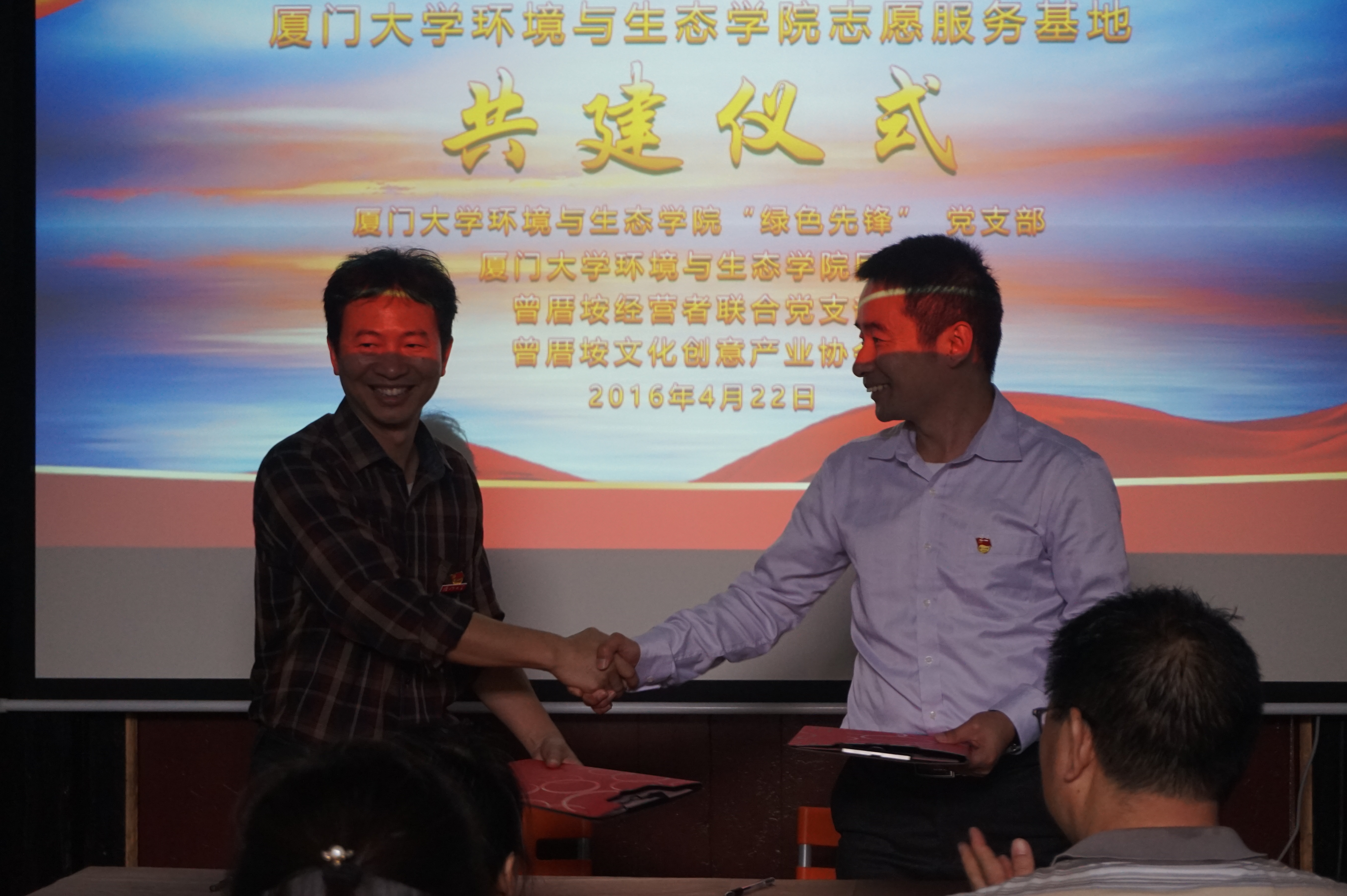 为深入学习贯彻习近平总书记系列重要讲话精神,全面落实校党委关于“两学一做”学习教育的部署安排,鼓励学生党员以实际行动争做合格党员,4月22日(世界地球日)下午,厦门大学环境与生态学院“绿色先锋”党支部和曾厝垵经营者联合党支部共建的“大学生党组织建设特色基地”和环境与生态学院团委与曾厝垵文创会共建的“大学生志愿服务基地”签约揭牌仪式暨环保宣传和文明旅游志愿活动在曾厝垵文创村文青学堂举行。