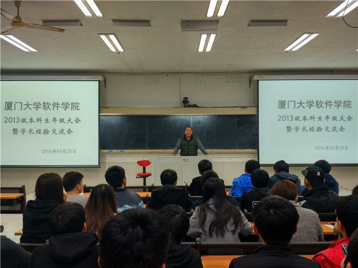 大三是人生选择的又一个岔路口。保研?考研?出国?工作?每一条路都通往未知的将来。为了减少同学们的迷茫,为大家的择业引导反向,提供借鉴,软件学院2013级本科生于3月25日晚在公寓教学楼301召开学长经验分享会,邀请班主任毛波老师、2012级学长长李江梦、杨泽煌、陆垚杰、王清水为大家传经送宝,解疑答惑。分享会由辅导员李绍玉老师主持。