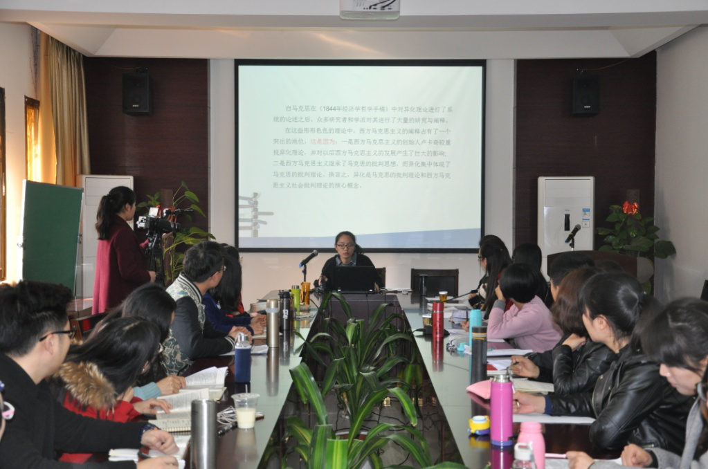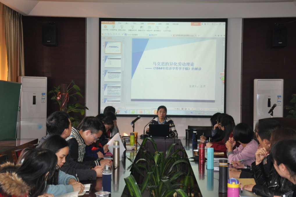 王月同学首先展示了自己的读书报告。王月同学马克思的异化劳动理论出发,对其作了简要介绍,并详细讲解了其中的概念界定、主要内容和产生的原因,最后着重阐述了她结合当代实际情况所领悟到的一些个人感受。之后是曾晞同学,她以西方马克思主义为视角,阐明了西马对异化理论的延伸,着重介绍了“消费异化”这一现象,并结合中国消费异化的现象对其缓解途径进行了个人见解的阐述。