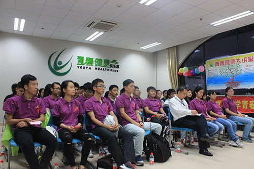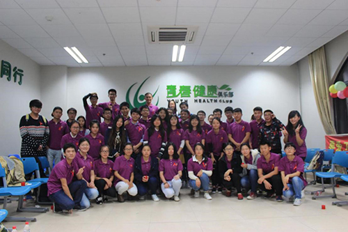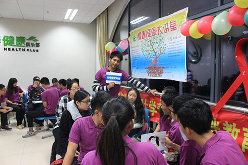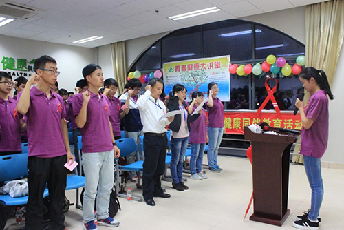 到场的同学穿上统一的青春健康T恤,并佩戴代表防艾的红丝带,表明共同抗击艾滋病的决心。