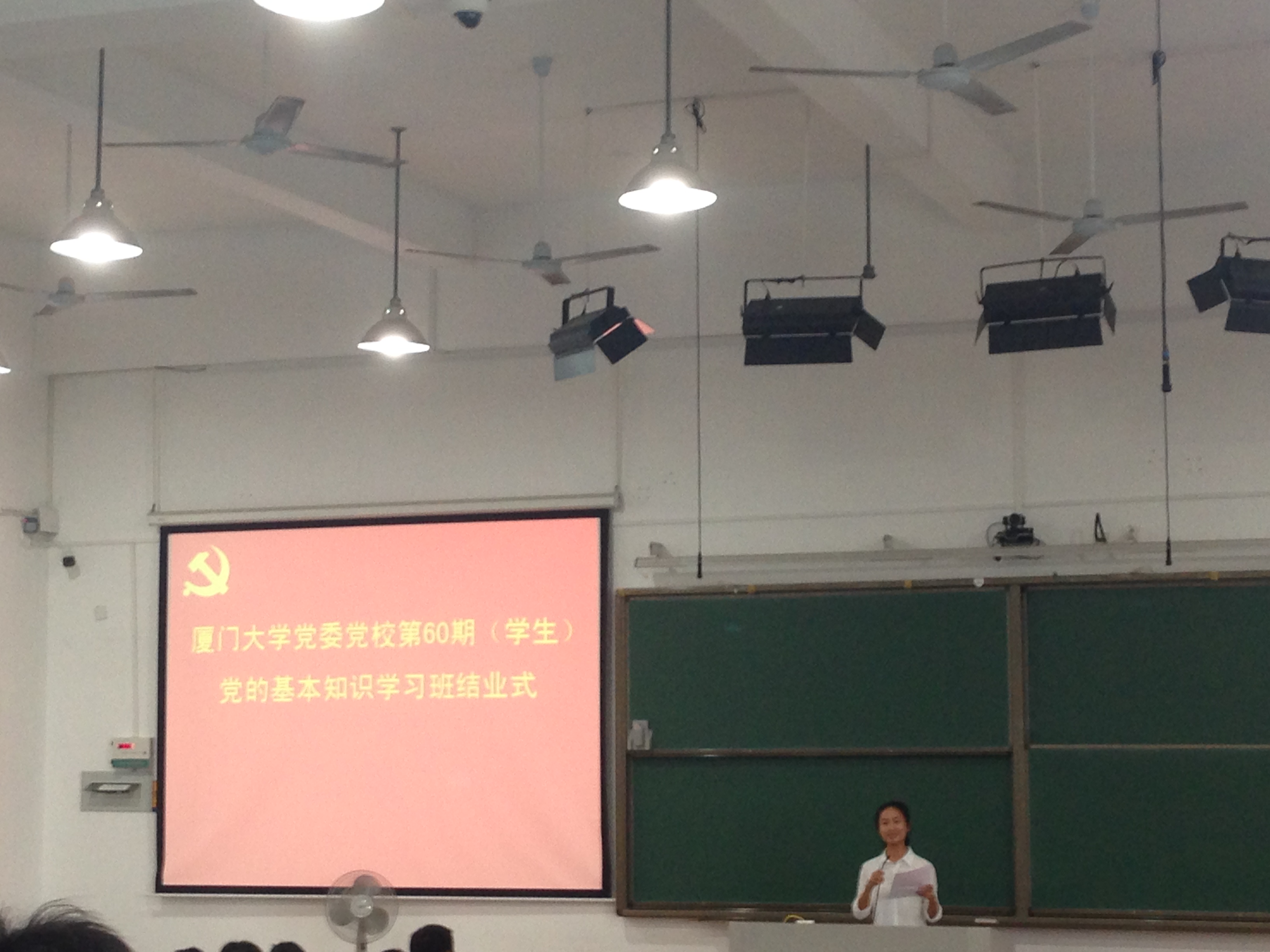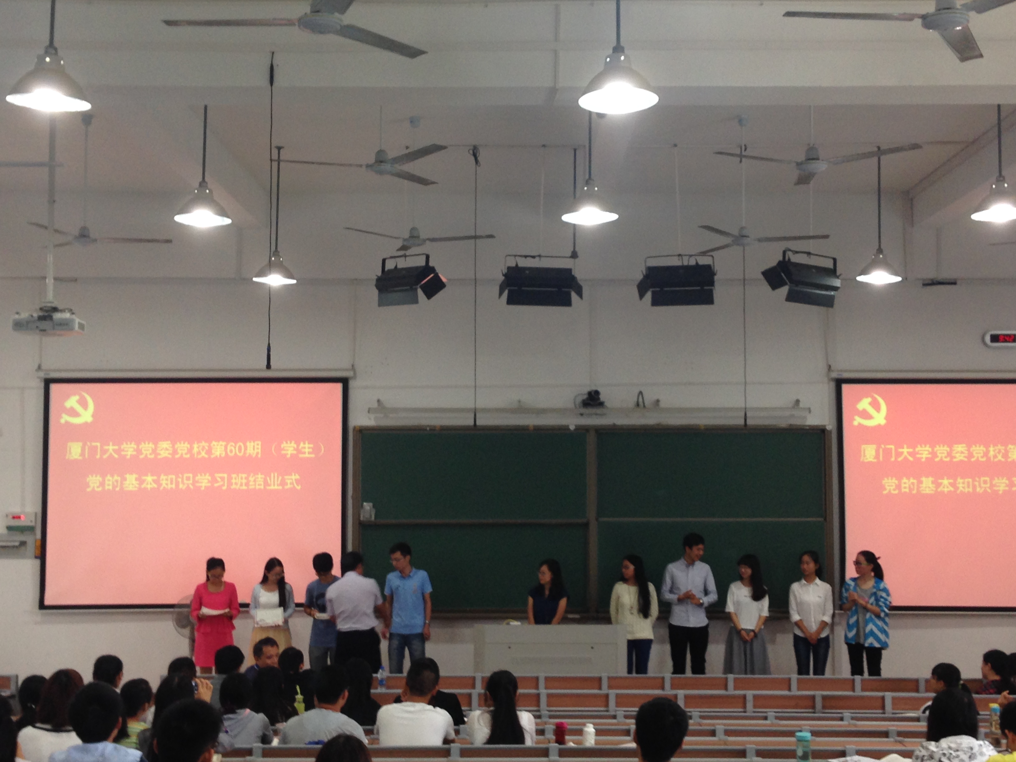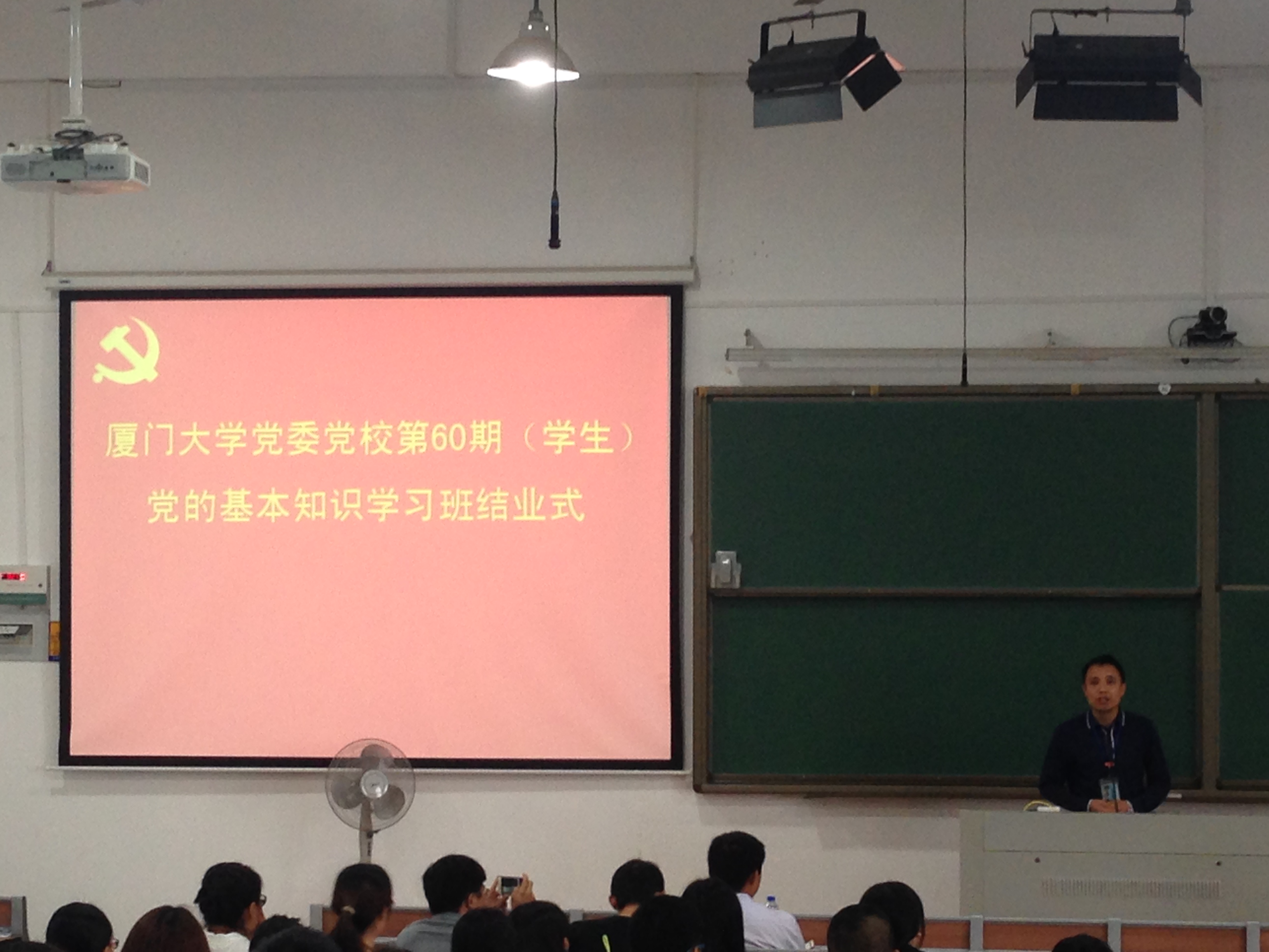 11月21日上午9点10分,厦门大学党委党校第60期(学生)党的基本知识学习班在翔安校区1号楼A401举行结业仪式。医学院党委副书记马龙、公共卫生学院党委副书记杨机像以及来自医学院、公共卫生学院、环境与生态学院的团委副书记和辅导员参加了结业仪式。本次仪式由公共卫生学院团委副书记黄佳佳主持。