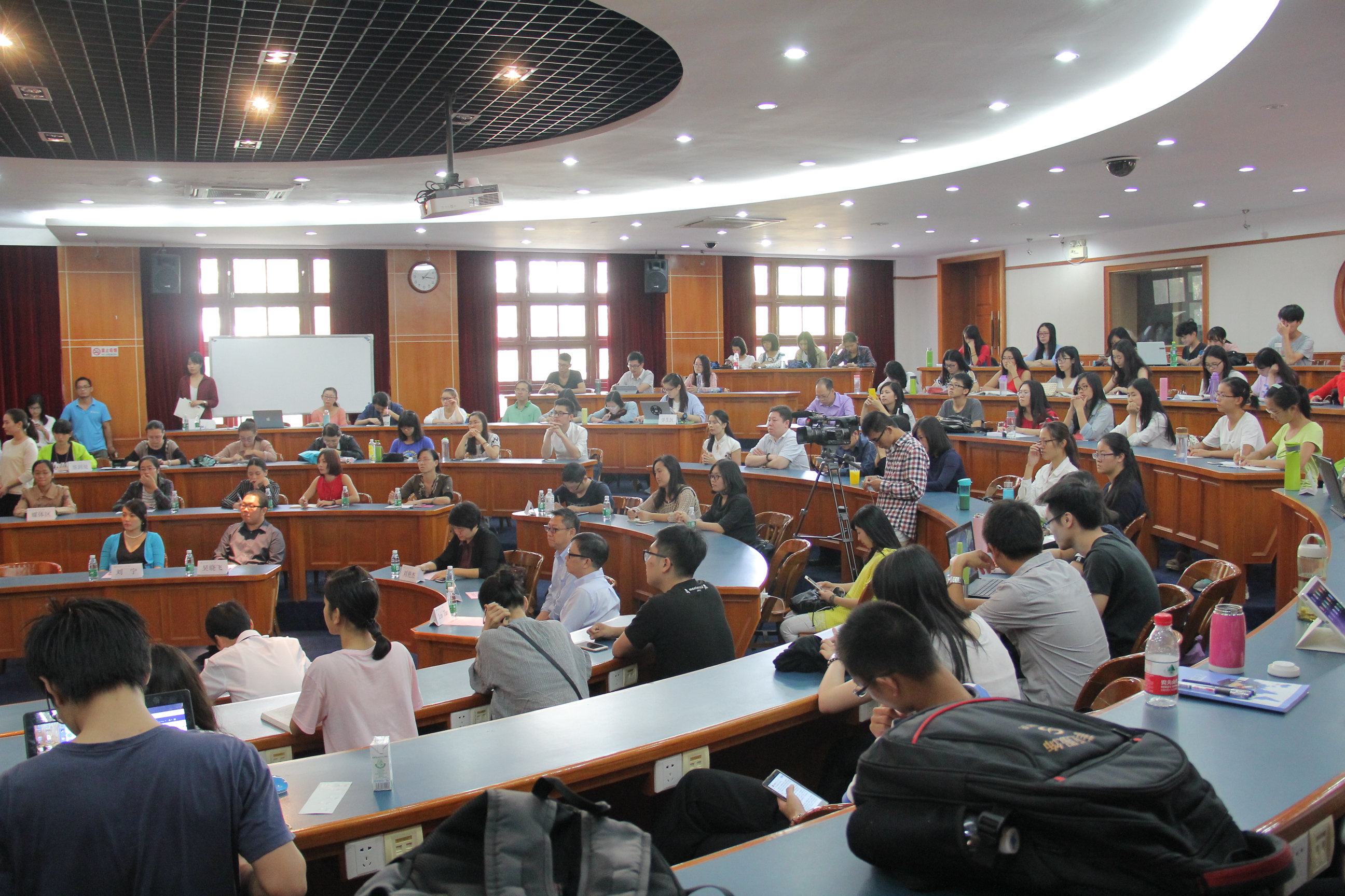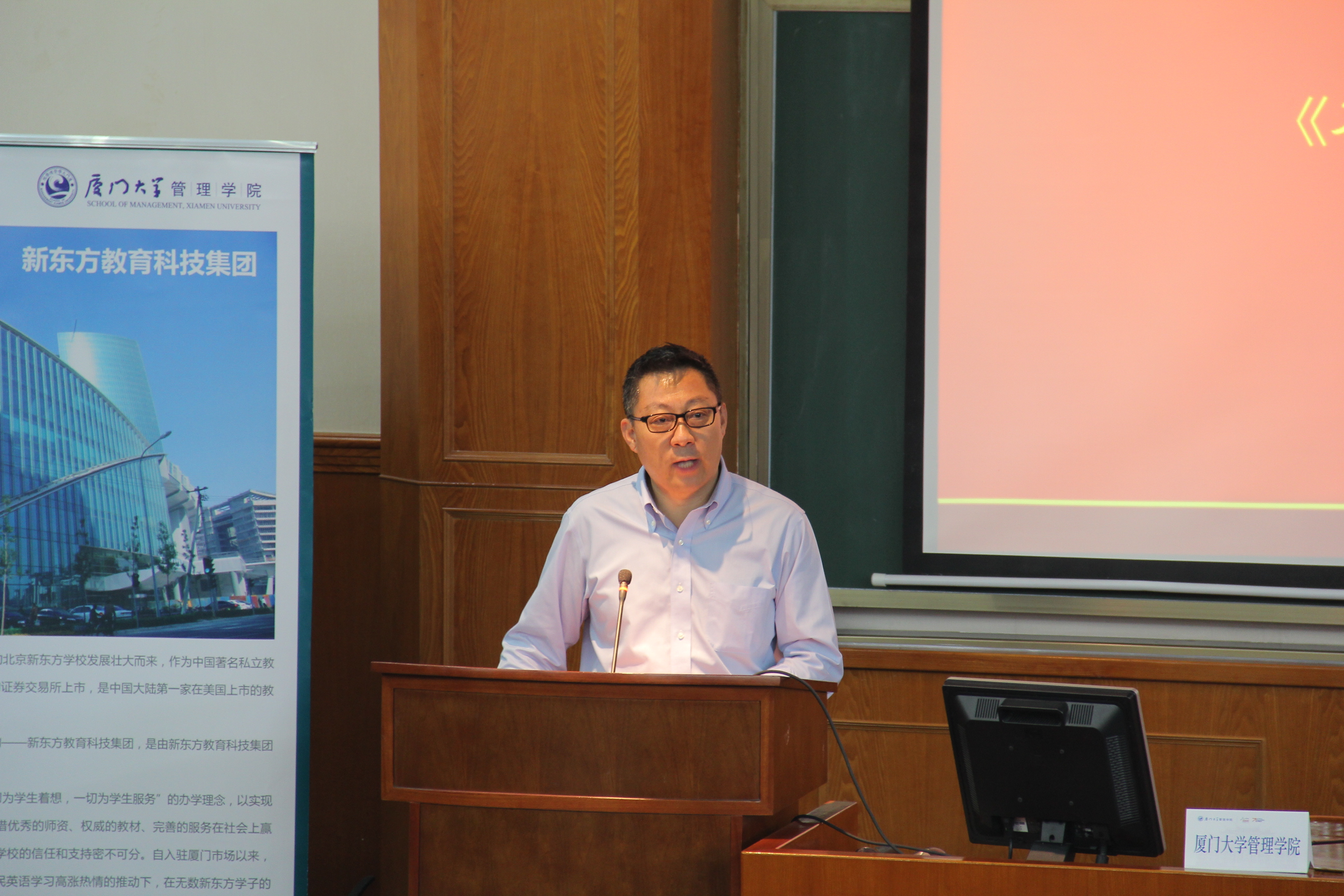 周先生首先谈到,他很希望厦门大学的学生能够来到新东方实习以促进两方的交流,接着,他分享了自己丰富多彩的个人职业生涯。在大学任教十二年后,出于开拓自己视野的目的他前往澳大利亚留学。在当时,许多留学生都选择了学习管理、经济、金融等,周先生却做出了与大多数人不同的选择——大众传播。在英国广播公司来澳大利亚招聘亚太记者时,他以全澳洲第一名的优异成绩从1000多名候选人中脱颖而出,成为英国广播公司记者。2000年,受当时任新东方总裁的俞敏洪先生的邀请,他放弃英国护照、优厚的物质条件毅然回国加盟新东方。周先生以他热爱教育的初心为我们展示了他精彩的个人经历,谈到语言和文字贯穿了自己的一生,以及他不忘初心、坚持教育的理念。他生动精彩的演讲赢得师生们阵阵热烈的掌声。