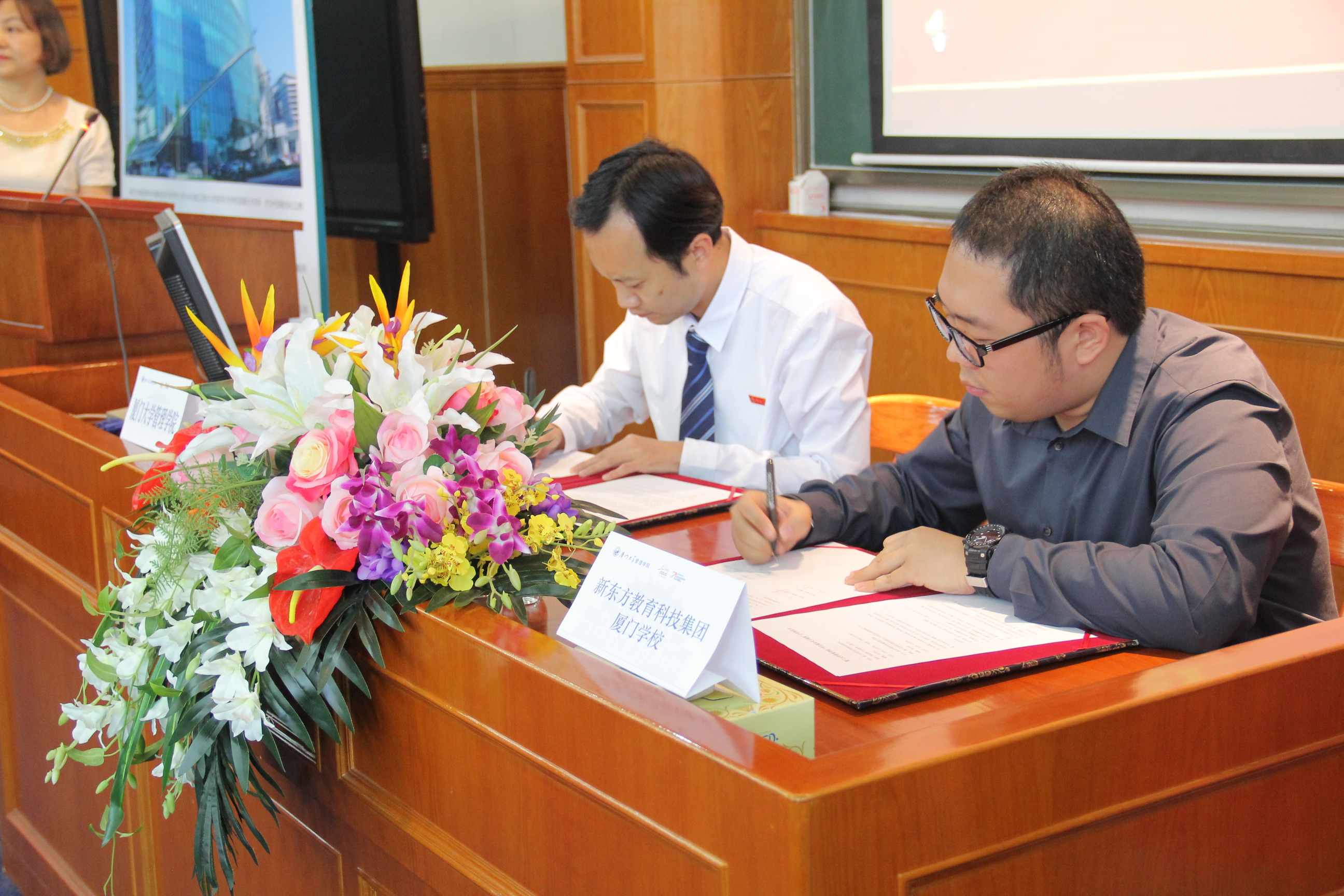李峰和吴晓飞进行了学生就业实习基地签约,李峰副书记代表学院向新东方厦门学校授牌。