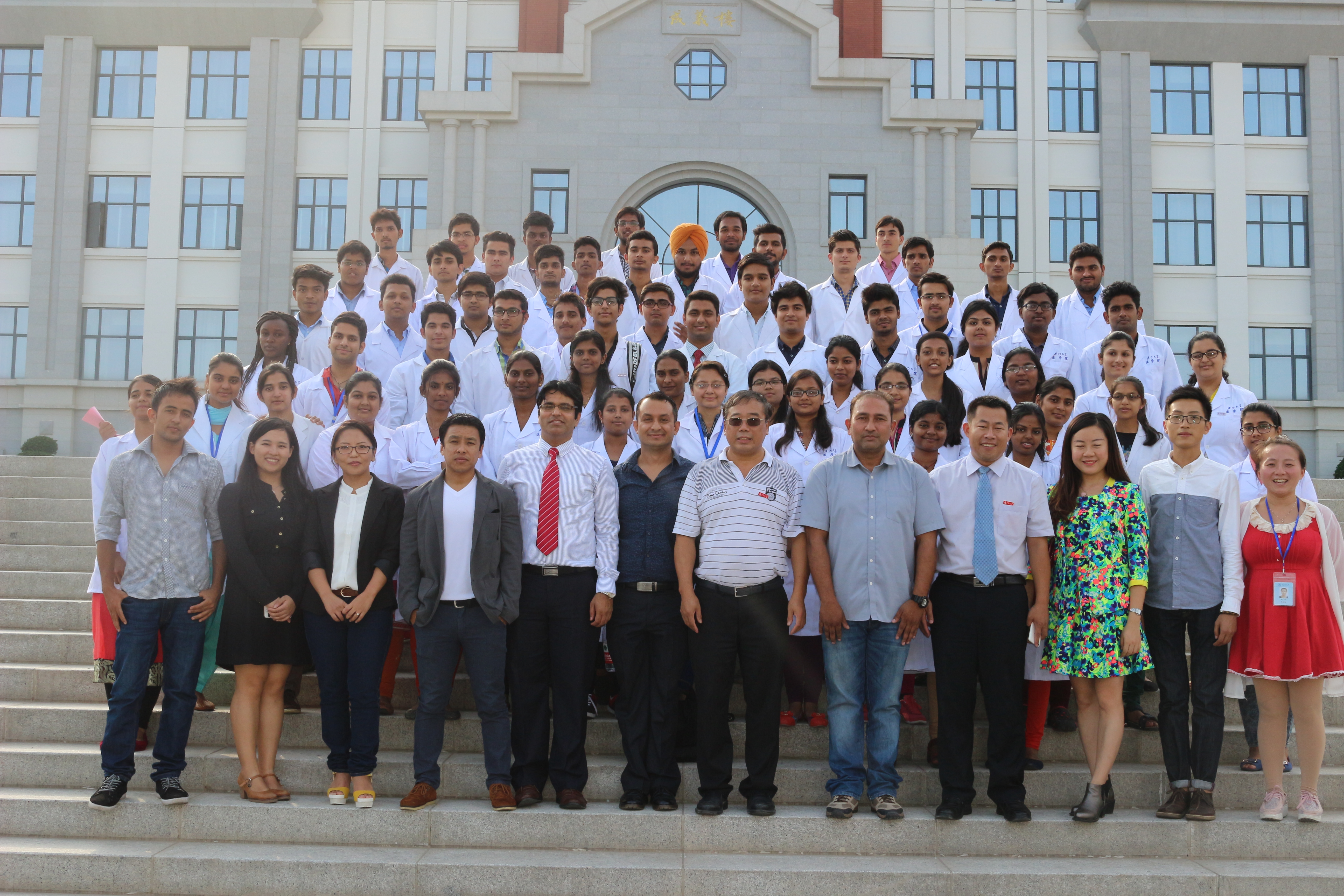 10月23日下午2:00,医学院2015级MBBS(Bachelor of Medicine, Bachelor of Surgery)留学生开学典礼在爱礼楼104隆重举行。60名2015级留学生身穿白大褂,喜气洋洋参加典礼。出席典礼的有医学院副院长齐忠权、院党委副书记马龙、中外教师代表、辅导员、秘书和学生会留学生分会代表。典礼由辅导员程芬老师主持。