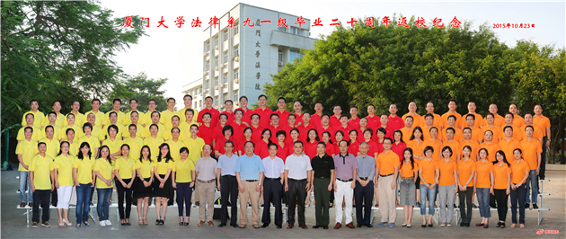 离别母校20年的校友们欢聚一堂,回首一起走过的青春岁月。当天下午,全年级三个班大约120人一起来到了法学院,他们分别身着红黄橙三种颜色的纪念衫,在法学院大楼前合影留影。晚上,91级的校友们还邀请了与他们朝夕相处了四年的老师们,和在读的学弟学妹们,一起举行了毕业20周年返校纪念活动。参加纪念活动的有法学院老领导及现任领导、课任老师以及学生志愿者等。