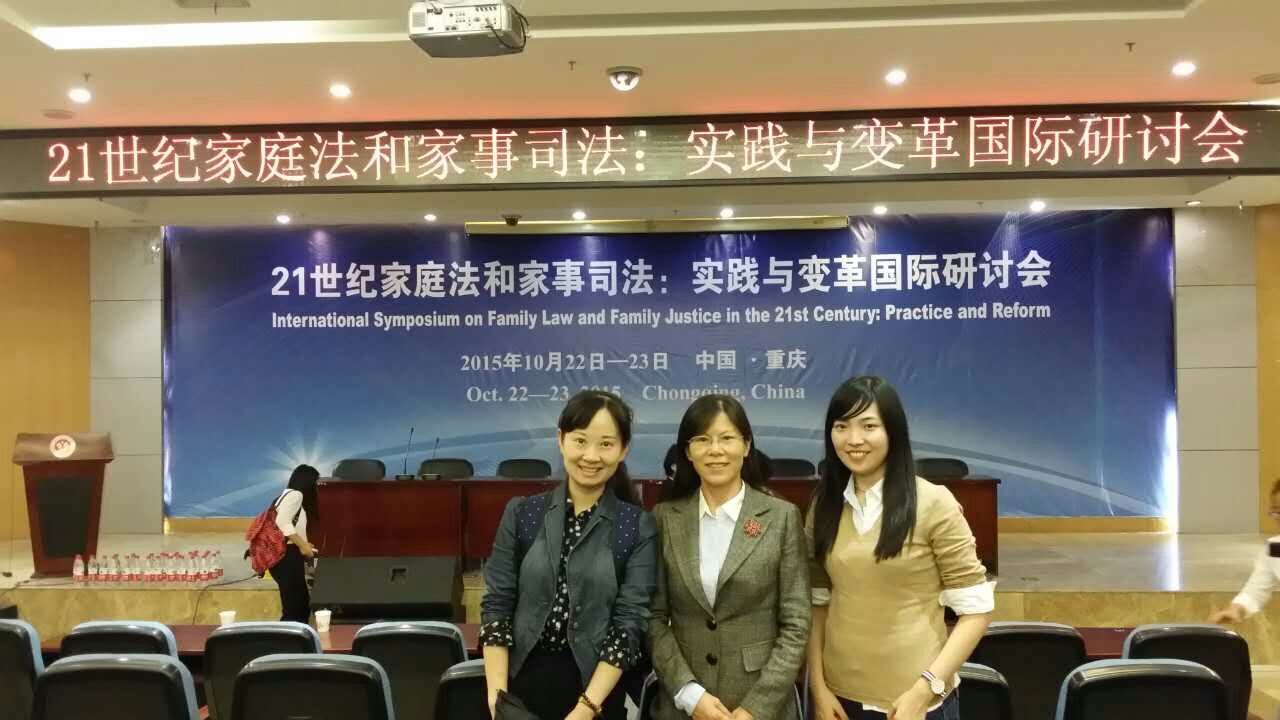 “渝北峻岭绵延、西政群贤毕至”,2015年10月22日,由家庭法国际学会、中国法学会婚姻法学研究会、中国婚姻家庭研究会和西南政法大学联合举办,西南政法大学民商法学院和外国家庭法及妇女理论研究中心共同承办的“21世纪家庭法和家事司法:实践与变革国际研讨会”在重庆西南政法大学召开。这次会议有来自英国牛津大学、美国杨百翰大学、日本大阪大学、韩国首尔大学、中国政法大学、中国人民大学、北京大学、厦门大学等海内外高校教授以及全国人大常委会法工委、最高人民法院、各地高级人民法院、中国婚姻家庭法学研究会等专家领导50余人。我院蒋月教授携博士研究生一同赴渝参加此次会议。