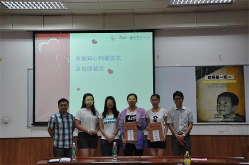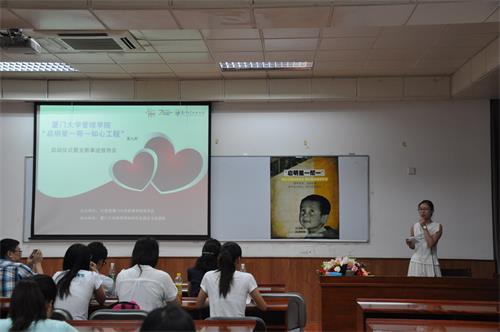 活动准时开始。“衣衫褴褛的孩子,在贫穷困苦的环境下,却紧握着改变命运的笔杆,闪烁着渴求知识的双眸。”一段感人肺腑的往期视频回放过后,在场的同学无不为之动容,也让在场的2014级同学对知心工程有了初步的了解。而后由蒋超杰致辞,她为大家讲述了知心工程的成立历程,同时也寄语在场的2014级同学梦想接力,让爱传承,尽自己的一份力量关心和帮助贫困山区孩子的成长。接下来进行2013级企业管理系硕士党支部、财务学系硕士党支部与2014级企业管理系硕士党支部//财务学系硕士党支部知心档案交接仪式,由各支部党支书完成交接并合影留念。接力棒交接结束,2013级企管系硕士党支部书记李梦迪同学、2013级财务系硕士党支部党员代表王红娟同学分别上台发言,与在场每一位分享他们的肺腑真言。她们着重强调在“一帮一”过程中是一份责任心的体现,更多的是通过与贫困山区孩子们的书信往来,分享丰富多彩的大学生活,启迪他们的梦想,而不是简单的金钱上的帮助。长者心语,铭记于心,2014级企管系硕士党支部书记林丽容同学、2014级财务系硕士党支部书记李梦丹同学随后发言表示将带领各自支部将这份爱心延续和传承下去。本场活动的压轴,是由有着丰富支教经历,并曾经前往海原支教的2011级企业管理硕士郭奇上台分享,他说到自己曾经在海原支教辅导过的孩子最终圆梦厦大并走出大山的时候,喜悦发自肺腑,也在告诉继任的学弟学妹们点滴的付出在不经意间却获得了不平凡的成就。