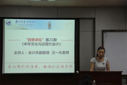 2015年5月28日晚上7点,厦门大学管理学院第二十一期“四季讲坛”学术讲座在嘉二201教室举行。这次讲座有幸邀请到了我院会计学系的汪一凡副教授,讲座主题是“中华文化与近现代会计”。参加此次讲座的有管理学院辅导员刘群鑫老师。管理学院温兆琦同学担任此次讲座的主持人。