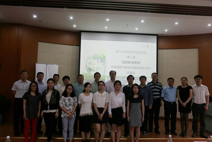 5月27日上午9:00整,环境与生态学院第一届“正青春·绿家园”环境保护与生态文明科技文化节在环境与生态学院B103多功能报告厅正式开幕。厦门市政协人口资源环境委员会副主任蔡加培,关琰珠处长、厦门市环保局纪检组组长师强、厦门市环境宣传教育中心主任余进、中国科学院城市环境研究所研究员于鑫、厦门大学翔安校区党工委副书记、管委会副主任高忠华、学生处副处长、翔安校区学生办主任张清榕、团委副书记、翔安校区团工委书记洪海松、翔安校区教务办王雪燕、医学院党委副书记马龙以及环境与生态学院院长李庆顺、副院长曹文志、党委副书记周克夫和许美霞等出席了开幕式。环境与生态学院,能源学院,新闻传播学院相关的老师和同学们近150人参加了本次活动。