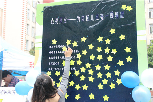 整个活动由四个子活动组成。负责“牵手星星”活动的志愿者们面带微笑地为每一位前来参观画展的人系上蓝丝带,并向他们赠予另一条蓝丝带,让他们进行“接力系带”,让关注自闭症儿童的人群不断地扩大;在蓝帐篷下,“走进星心”的活动吸引了不少人的驻足,每答对一个有关自闭症的问题,就能获得志愿者们精心准备的奖品——印有孩子们画作的明信片,这让不少曾对“自闭症”一无所知的人们对其有了全新的认识;而在“点亮星空”的活动中,人们在星星形状的便签纸上写下对自闭症孩子们的祝福,贴在现场准备的“星空”中,将黯淡的夜色全部点亮,汇成了一片星星的海洋;参加“定格星片”的同学们则手持相框,以自闭症孩子们的作品为背景合影留念,许下真诚的誓言:“我承诺,做星星的守护者。”他们立志成为勇敢的“卫士”,守护这些像星星一样的孩子们。