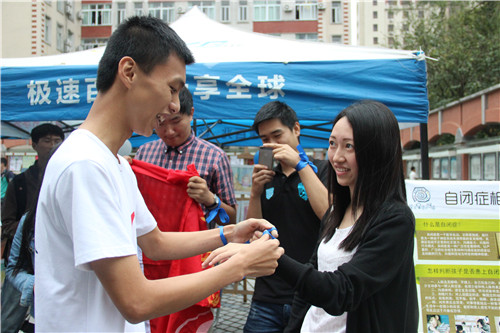 除了厦大的同学们,还有一些游客也积极地参与其中。一群路过的美国游客们停下脚步,认真地与志愿者们交流着,了解有关自闭症儿童的知识。同时,他们也为那些孩子们送上了来自大洋彼岸的祝福。大爱无疆,不分国界的善意更加令人感动。