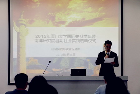 2015年5月15日上午9:00,厦门大学国际关系学院暨南洋研究院暑期社会实践启动仪式在南安楼316顺利举行,为同学们的暑期社会实践拉开了华丽的序幕。本次仪式由社会实践与就业促进部部长陈右任主持,国际关系学院2013级、2014级全体本科生参加了仪式。出席本次社会实践启动仪式的还有厦门大学国际关系学院暨南洋研究院党委副书记黄俊清老师,团委书记兼辅导员沈丽秀老师。