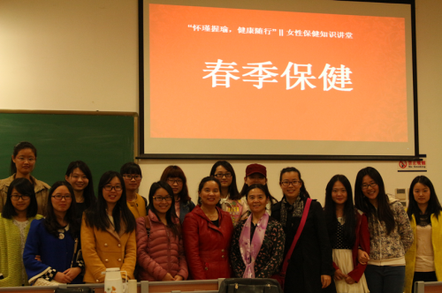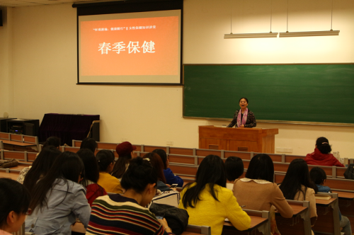 郑建红女士从自身擅长的中医领域入手,以“春季保健”为主题,详细讲解了“春季感冒预防和治疗”、“抑郁症的危害”、“劲椎病、骨质增生预防”、“合理营养搭配”、“女性经期调养”、“乳腺增生预防”六个方面的知识。随后,她还现场示范了简单穴位按压等保健小窍门,听讲同学紧跟讲解步骤进行操作,现场气氛良好。
