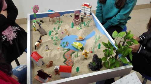首先,祝老师向在场成员介绍了沙盘游戏的相关规则及注意事项,并带领大家进行了团体沙盘的体验。成员们将理论知识和自身实践经验相结合,大家一起摸索,利用沙子、沙具等工具,体验沙盘游戏疗法的神奇。随后,大家分别对沙盘作品命名,并分享了制作过程的感受,对摆放的沙盘游戏作品进行心理学方面的探索与研究。