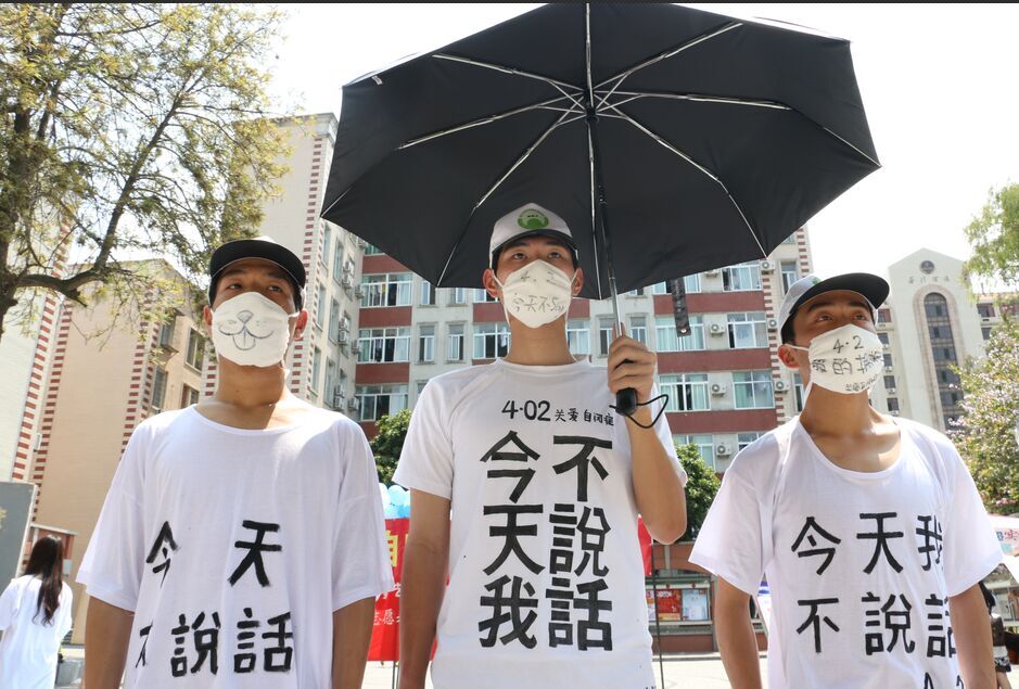 在络绎不绝的人潮中,手持黑伞,身着白色T恤,上书“今天我不说话”的三位同学在烈日的炙烤下纹丝不动,显得尤为突出。作为本次活动的最大亮点,活动设计者林同学表示,这样行为艺术是将自己当做自闭症儿童,模仿病征,向其他人传达出自闭症儿童所患有的社交障碍,以及间接导致的语言障碍、保持缄默甚至行为异常的症状,以黑白两个色系的服饰搭配在彩色的背景下让人感觉突兀而震撼,吸引更多人围观行为艺术,并且通过先吸引后解说的形式,加深参观者对于此项行为艺术目的的理解。该环节从活动开始一直持续到活动结束,除去中途休息的十分钟,三名同学的站立姿势在高温下维持了将近两个小时,这不仅仅是以实际行动向过往的人员展现自身对于自闭症的理解,更是一种情感的溶入,一种正视差别但不歧视的态度,让在场的观众都惊叹不已。