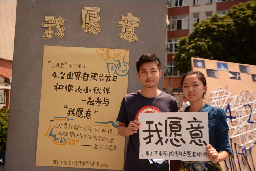 活动现场,公众手举三个大字“我愿意”,这并不是婚礼现场新郎新娘所呼喊的对白,而是艺术学院青年志愿者协会针对“关爱自闭症”儿童向公众发出的倡议,发出“我愿意拒绝误解,不再歧视;我愿意帮助并关注自闭症儿童”的宣言,鼓励现场参与活动的师生、游客积极参与到活动中来,由协会工作人员收集倡议图片,并将其整合公布于微博、微信等受众面较广的信息宣传平台,以此项倡议活动让参观者体验与众不同的志愿者服务心事,让参观者由活动客体变为活动主体,以自身参与宣传活动更增加其感知与深刻印象,向社会其他人士展现对于自闭症儿童的关注,借由此活动,鼓励世人公平对待自闭症儿童,倡导消除在自闭症病征上的误解与行为上的歧视,为自闭症儿童获得更加良好的成长环境而不懈努力。