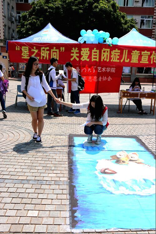 几台相机、若干画笔、靓丽颜色、可爱主题在几个日夜后跃然纸上。也许你会以为活动展板、场地都是活动借由开展所依托的物质条件,但如果展板上开个大洞并通向未知的沙漠是否会引起你的注意?如果地板突然出现阶梯开始通向无边的星空是否会引起你的深思?如果在30度的高温下地面涌现一汪冰川湖水是否为你引来一阵清凉?这样的神奇画作并不只有在艺术馆或网络上才能得以看见,在昨日的三家村学生广场,艺术学院青年志愿者协会结合当代艺术形式,将3D画的创作手段结合“关爱自闭症儿童”的活动主题,由协会成员共同完成“冰川救援”、“走向星空”、“探寻沙海”等3D立体画,意在通过画面带来的视觉效果与志愿者的热情引导,让参观者完成指定拍摄动作的同时,让他们感受自闭症儿童隐于自我的世界、社交障碍等特征,呼吁他们伸出援手,感受关爱的所带来的力量。