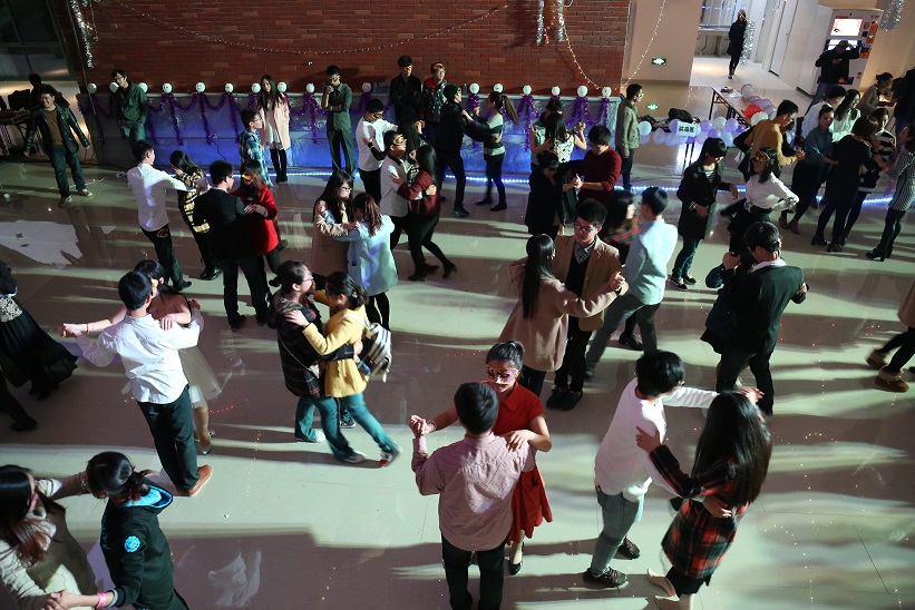 优美的舞曲完毕,随即而来的是“男女搭档”的游戏环节,“喝饮料”、“喂果冻”以及“口传荧光棒”比赛,考验的是男女之间默契的配合。紧张激烈的过程和男女搭档时滑稽的动作引来了同学们阵阵欢笑与喝彩。