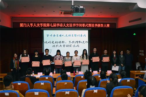 “品中华经典,传亘古文明”厦门大学人文学院第七届书香人文读书节于近日落下帷幕,本次读书节由人文学院团委主办,人文学院学生会学术部承办。从2014年11月10日开始,活动历时一个多月,包含汉语经典名篇诵读大赛、汉语写作大赛、“胶片定格传统传统,光影漫叙文化”摄影比赛、“走进中华传统文化”实体体验活动以及人文社科经典读书报告大赛等五个部分,并配以中华传统文化知识定期推送等线上活动。读书节累计吸引了来自人文、经济、信科、海洋与地球、海外教育、管理、新传、公事、土建、物机等十多个学院学生参加,在校园内掀起了一股多读书,读好书,乐读书,弘扬中华优秀传统文化的风气,营造了浓厚的书香校园氛围。