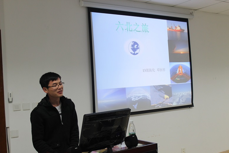 活动伊始,邓恒祥就与大家分享了他乘坐雪龙号科学考察船远赴北冰洋进行科学考察的经历。他讲到,科学考察其实是一件非常辛苦的事情,但是在辛苦的同时又会有许多的乐趣,他为同学们讲述了“雪龙”号科学考察船以及这次远航中一些有趣的小插曲,引起了同学们对出海考察的浓厚兴趣。