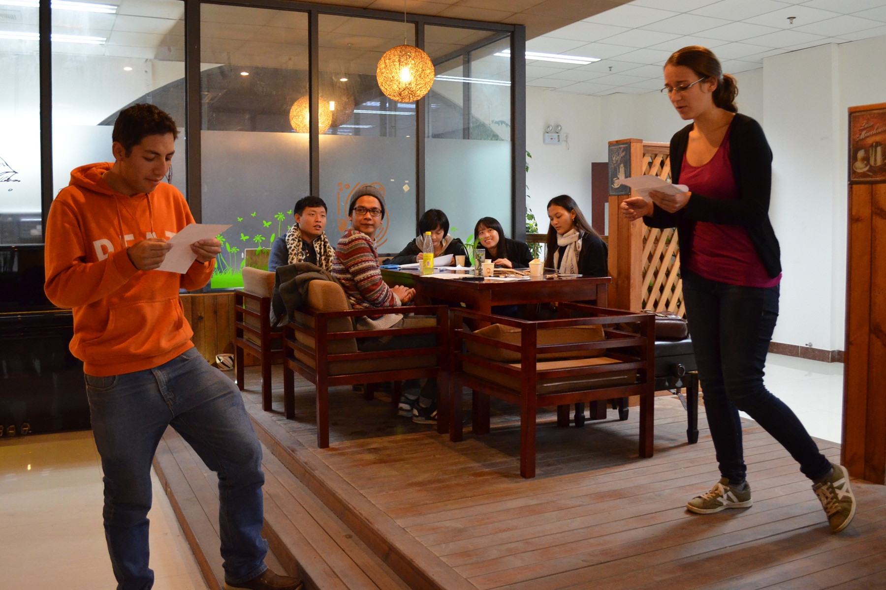 整个表演环节咖啡厅充满了欢声笑语,第一组的表演幽默搞笑,赢来了阵阵掌声;第二组派出的是一位中国同学和一位德国女生,中国同学使用英文,而德国女生用中文进行表演,他们的发音准确、对白流利,得到了同学们的赞赏;第三组则由两位外国同学用中文演绎剧本,他们丰富的肢体语言吸引了大家的眼球。