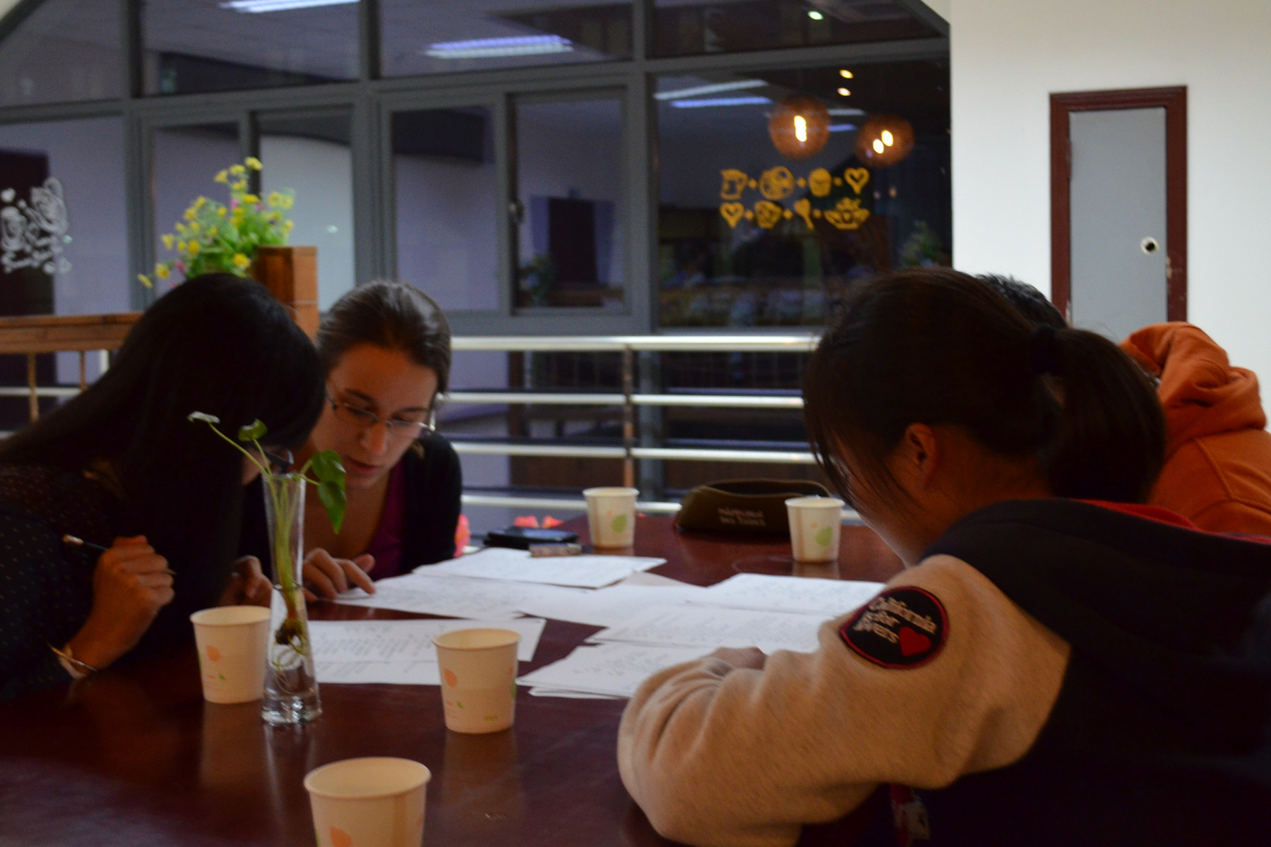 首先,参加活动的同学被分为三个小组,在组内互相介绍并自由交流,增进对彼此的了解。接下来,组织人员为每个小组发放《罗密欧与朱丽叶》的小段节选剧本,让同学们熟悉剧本,准备表演。各组同学纷纷组成中外搭档,互相用中文和英文帮助对方了解剧本。在学习剧本的过程中,同学们不仅学到了新的单词生字,而且对中西方文化尤其是与莎翁剧本有关的西方文化有了更深刻的认识,促进了中西方文化交流。