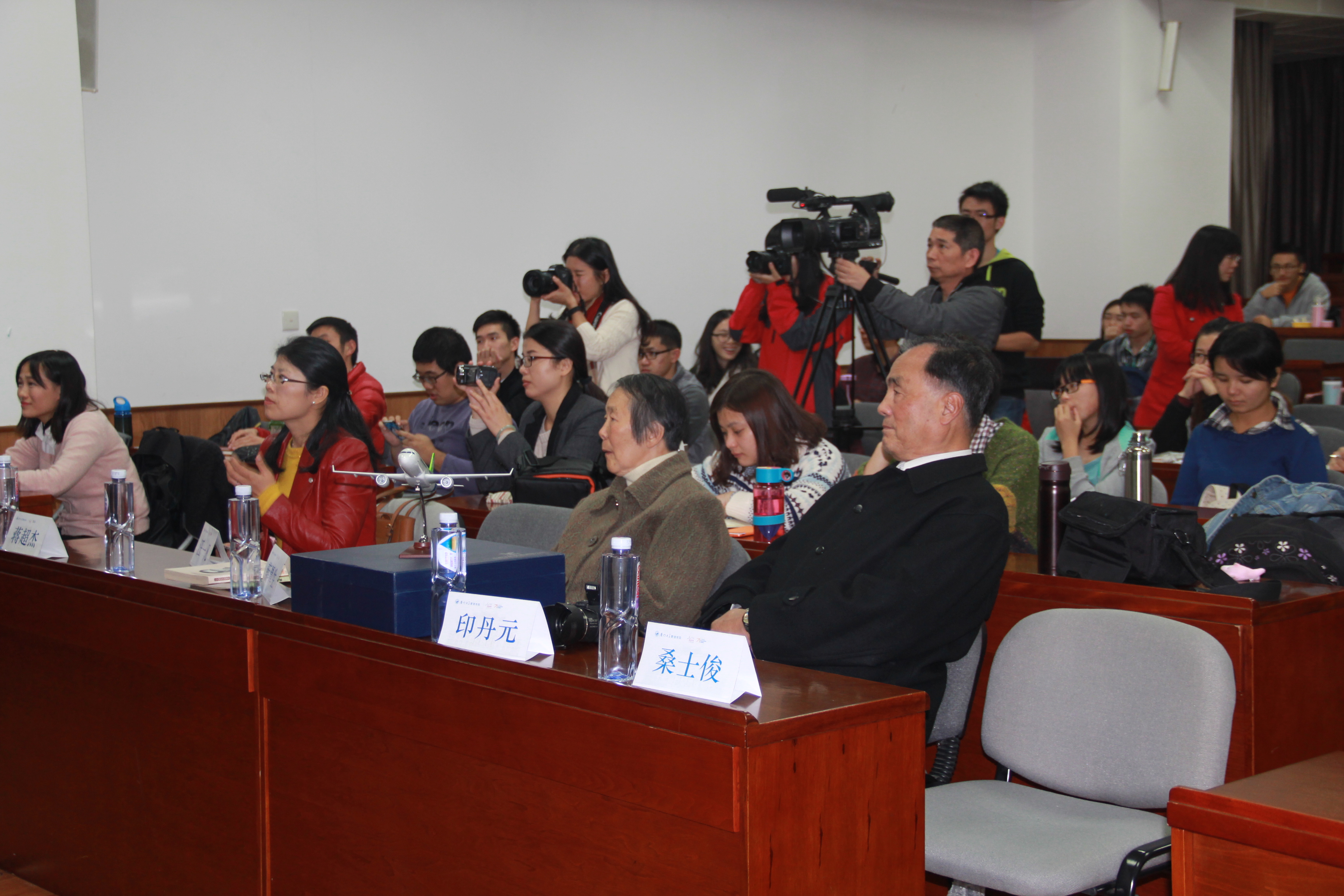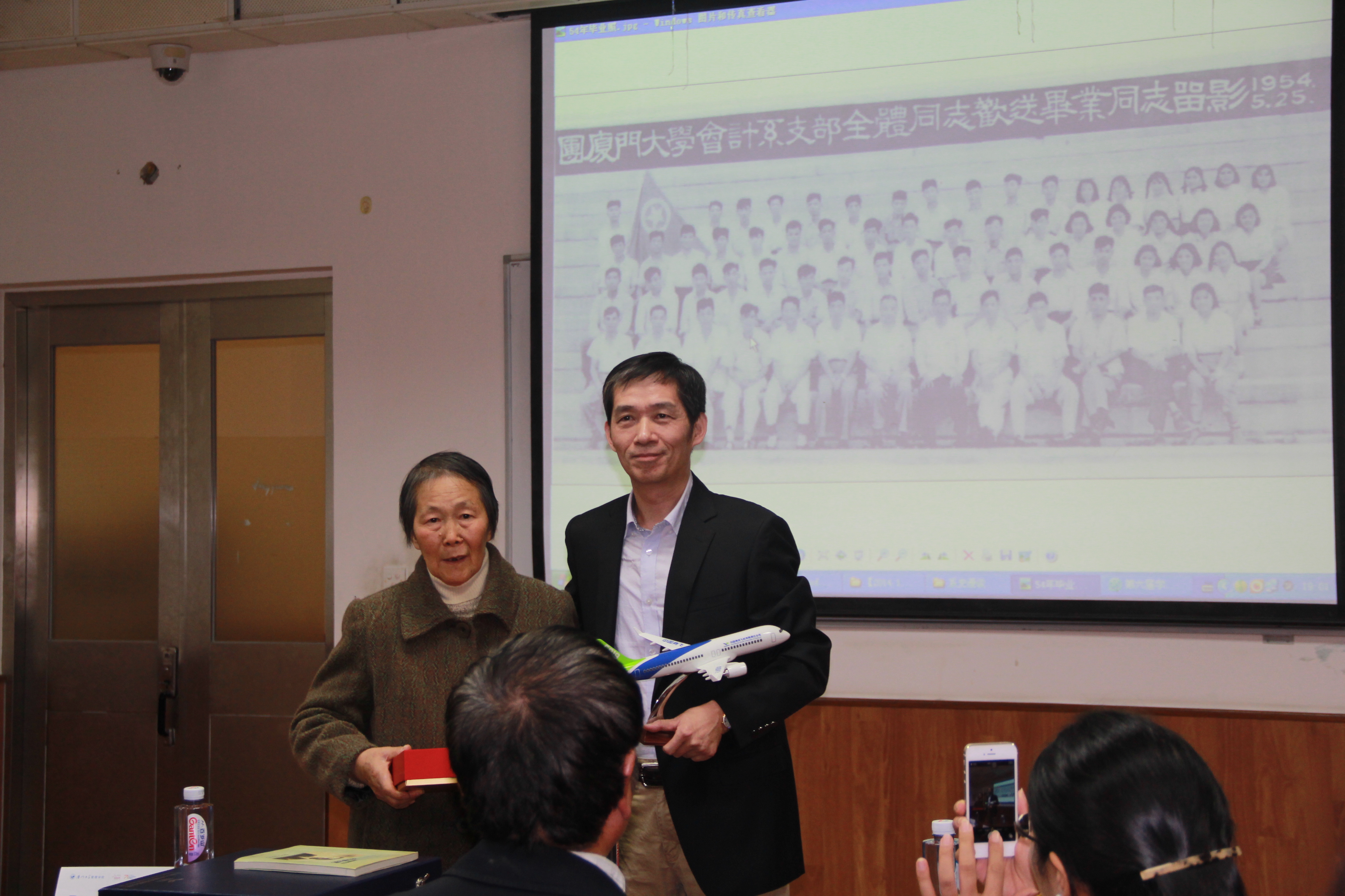 主题讲座正式前,桑士俊为本次讲座致辞,明年将是会计系创系90周年,而今天也是一个意义非凡的日子,会计系第一位毕业生薛一瓒的后人——女儿薛潭生女士和女婿印丹元先生特意来到这片老先生曾经学习生活过的土地参观。经过一整天的校园参观后,两位老人也是感慨万千。随即进入互赠礼品环节,两位老人将从远方带来的一份意义深远的礼品——飞机模型和两本自传书赠送给会计系,而桑士俊作为会计系代表,也向两位老人回赠了一份珍贵的礼物。现场掌声如雷,同学们都为见证了这一历史性时刻而激动不已。