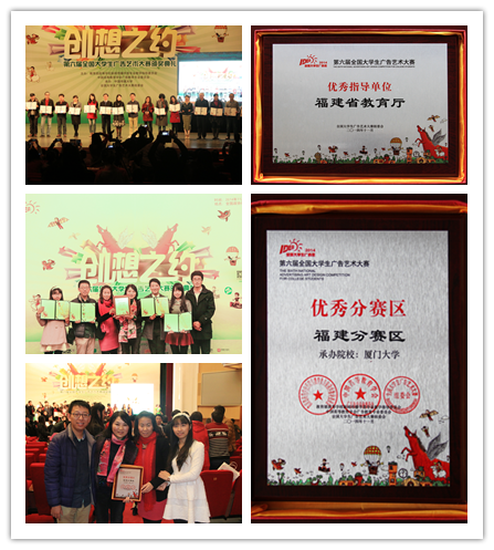 11月16日,第六届全国大学生广告艺术大赛颁奖典礼在北京全国政协礼堂隆重举行,教育部原副部长吴启迪、教育部现总督学杨贵仁等出席颁奖典礼并为获奖者颁奖。厦门大学新闻传播学院广告学系学子喜获全国银奖一件、铜奖两件,优秀奖八组,并为福建省教育厅和厦门大学赢得全国优秀组织奖。获奖者有吴凯瑜、崔凯、刘瑜、毕森、张宇弛、庞昕瀚、王菁等同学。除了在全国大广赛获奖外,新传学子的作品还获得第六届大广赛福建、海南赛区一等奖、二等奖、优秀奖。同学们创造的成绩与各门课程老师知识的融汇有关,因此这成绩不仅仅属于同学和指导老师,更属于全体的老师和同学。