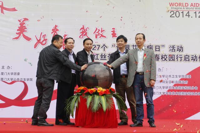 公共卫生学院院长夏宁邵教授与厦门市计生协会副调研员梁国松、厦门市疾病和预防控制中心副主任陈敏、翔安区人口和计划生育局局长洪求瑛、翔安区计生协会副会长黄克明共同启动厦门大学“美好青春我做主”红丝带健康大使青春校园行活动。该活动由国家卫计委、共青团中央发起,在包括厦门大学在内的全国16所高校推行,旨在增强大学生对艾滋病的防护意识,提高自我保护能力,推进大学校园防艾活动的深入开展。