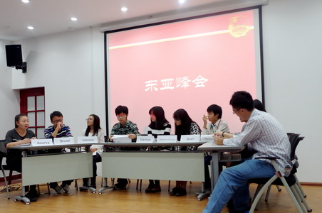 “东亚峰会”是本次主题团日活动中结合专业特色与时代热点的创新环节,除了提高学生的参与热情,也旨在体现“学有所用”的理念。十名学生代表分别扮演中国、美国、菲律宾等十个国家的大使,就菲律宾军事卫星发现中国在安达礁“填海”这一问题展开磋商。“峰会”包括立场陈述和自由辩论两个部分,引发了团日活动中最为紧张激烈的思维“碰撞”。其中,中方代表沈度同学面对各国“诘难”,却临危不乱、“舌战群儒”的作风最令人印象深刻。