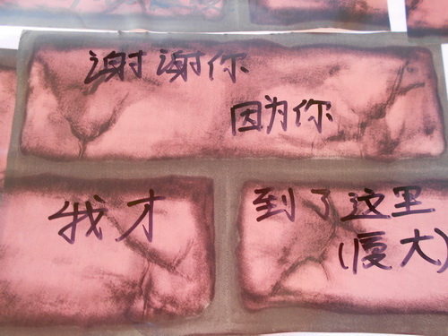 三家村的这一处是未成形待搭建的感恩小屋,清晨的微黄阳光打在空荡荡的感恩墙上,感恩小屋充满浓浓温情。一个悠长的下课铃声,带来了一大波的观者。志愿者们也忙碌了起来,耐心地介绍着感恩小屋的搭建方法。在工作人员的细心讲解下,观者便成了参与者。参与者手握着各色的马克笔,在砖红的墙纸上写下心底的感恩寄语,而后小心翼翼地贴在“感恩墙”上。尽管参与者有着不同的年龄来自不同的国度,写下不同的或稚嫩或飘逸的字体,对小屋倾诉的着不同的感恩,但他们都是怀着一颗感恩的心诉说——对亲人,对朋友甚至是擦肩而过的陌生人,都道出了最真挚的感谢。冰心语,走在生命路的两旁,随时播种,随时开花,将这一径长途点缀得香花弥漫。而感恩小屋慢慢地慢慢地建成,不正是在播种一颗颗感恩的心嘛?