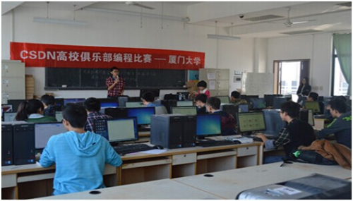 在比赛开始前,厦门大学CSDN高校俱乐部的工作人员测试了每台机器的上网环境。参赛同学提前30分钟到达比赛现场,检查编译环境,登陆CSDN账号,进入比赛页面,熟悉比赛规则和流程。有很多同学是第一次参加比赛,对于比赛环境和OJ平台的使用不是很了解,现场的工作人员进行了详细介绍,并针对有问题的同学进行单独讲解。