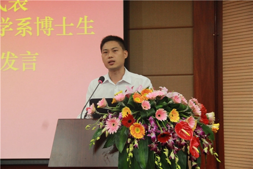 老生代表、财务学系2013级博士生刘羽中与在座的各位分享了其在学院硕博期间对“人生目标”、“归属感”的思考,并鼓励各位同学秉承厦大“自强不息,止于至善”的校训精神,努力锻炼成才。