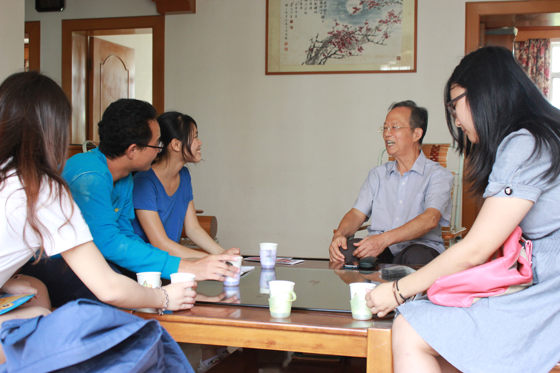 同学们一进门,洪老教授就亲切地招呼大家坐下,准备了热腾腾的茶水。洪老教授首先询问了同学们的学习﹑生活状况,还谈到了翔安校区这边的建设,对同学们很关心,并且细心地留下了同学们的联系方式。