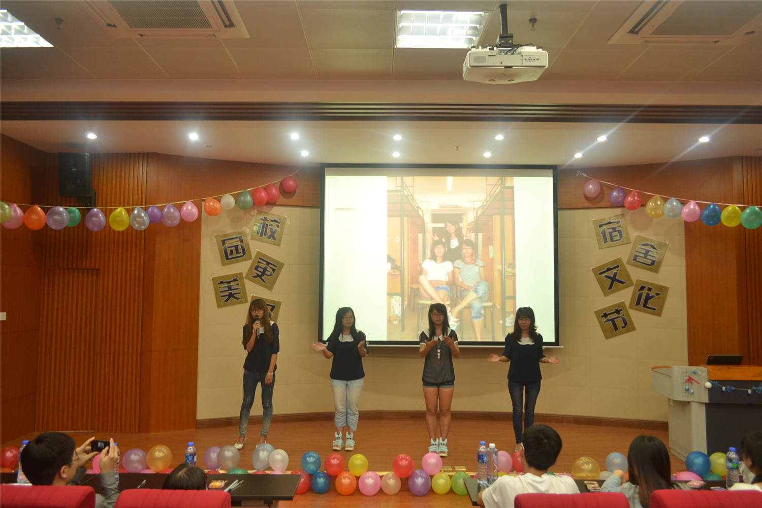 风采大赛由各参赛宿舍ppt展示和现场才艺大比拼两部分组成。F3-409首先登场展示。在舍长介绍了各位舍友从初识到相知、熟识的过程之后,她们在吉他与电子琴的伴奏下为大家带来一曲优美的《心愿》。同样,F3-407、F7-312、F3-404均以宿舍成员的生活趣事以及歌唱表演的形式展示,F7-312的《朋友》很好的表现出了宿舍的团结。而F4-212,这个大三女生宿舍,因为有了3年的积淀,展示更为丰富、温馨,更好的体现了宿舍文化节的主题。身着统一的服装,她们落落大方、全体上阵,在演唱《明天,你好》的时候,有3人配上了手语动作,使情感表达得更加充沛。无独有偶,在第二轮F4-208演唱《爱》的过程中也出现了手语。大三宿舍F4-214——“214科学实验室”这次也参加了宿舍风采大赛,这也是她们最后一次参加宿舍文化节,因此非常重视,她们为观众带来了颇有新意的幻灯片,献唱了一曲洋溢厦大特色的歌曲《映雪之国》;而F7-503在王毅风趣的讲解中,用制作精美的中国风展示、中国风歌曲《江南》以及精心编排的舞蹈征服了观众;F4-206改编自《北京东路的日子》的歌曲《住在206的日子》唱出了宿舍的一年的美好回忆;F4-210和F3-402也为观众带来欢乐的童歌串烧和美丽的《遇见》。
