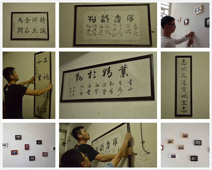 据悉,“墨香勤业”活动共分两大模块,一是展出各个宿舍的特色合照;二是装裱优秀的毛笔书法。早在一个月前,学生党员就开始“扫楼”,收集各个宿舍的特色照片,并精心挑选了相框进行装饰,努力营造家的气氛。不少大四同学看到宿舍合照后发出感慨:“不知不觉我们就要毕业了,时间过得可真快哎。”