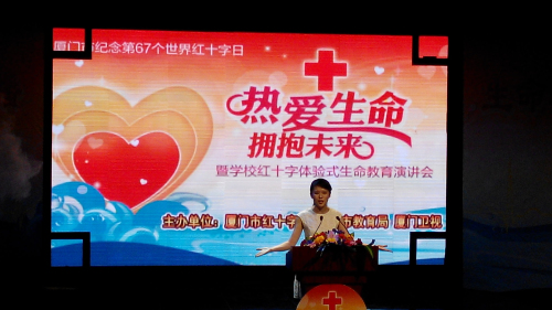 今年5月8日是第67个世界红十字日,主题是“人道传播 生命救护”。5月10日下午,由厦门市红十字会、厦门市教育局举办的以“热爱生命 拥抱未来”为主题的“厦门市纪念第67个世界红十字日暨学校红十字体验式生命教育演讲会”在厦门广电中心如期举行,我校医学院2011级临床医学系本科生郭以晴作为厦门大学演讲者参加了此次活动。