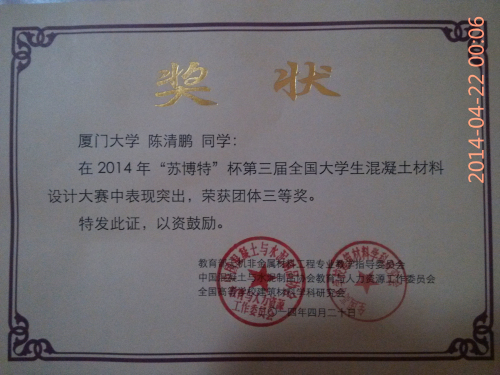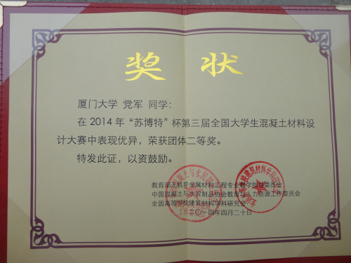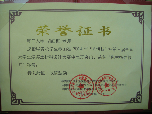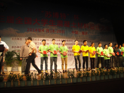 2014年4月18日至20日,规模盛大的“苏博特”杯第三届全国大学生混凝土材料设计大赛在重庆大学顺利闭幕。本次大赛中,来自全国61所高校的109支代表队经过紧张激烈的角逐,最终我校土木工程系两支代表队以优异的成绩分别获得了团体二等奖(叶明岳、李畅、党军)、团体三等奖第一名(陈清鹏、刘星帆、柯淼宏),土木工程系胡红梅教授获得“优秀指导老师”称号。