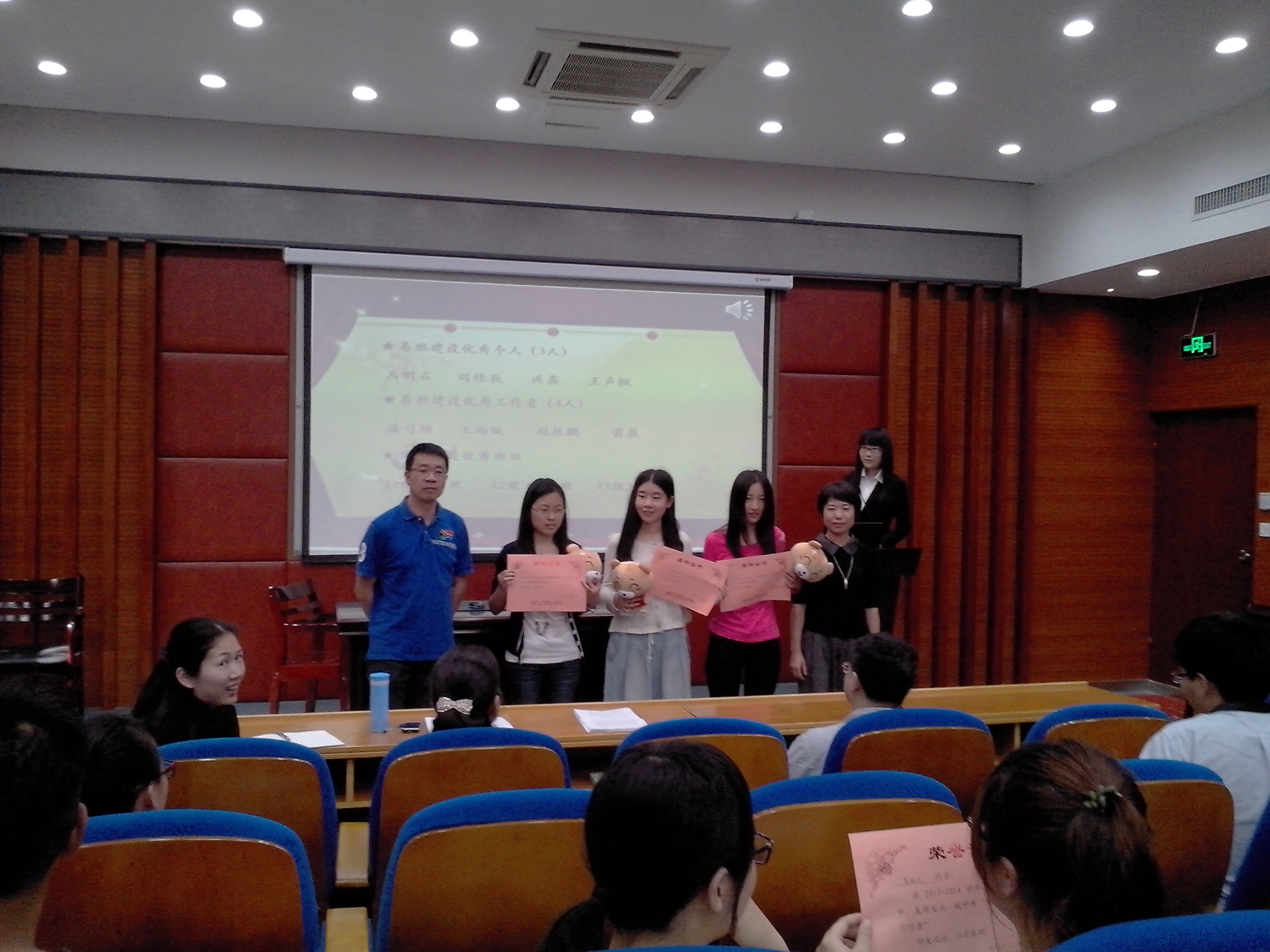 在表彰大会上,同学们通过视频再次深入了解了“易班”的功能。之后主持人宣读了学院的表彰决定,由在场的老师为获奖的同学和班级颁奖。本次大会评选出了四名“易班优秀工作者”、四名“易班达人”和三个“易班优秀班级”。荣获“易班优秀工作者”称号的赵振鹏同学以”易班是一班“分享了他使用易班的宝贵经验,他从易班与QQ、微信等平台的对比中突出易班在班级资源共享方面的优势,称易班促进了信息的传达,增进了班级之间的交流,是一个方便快捷的网络信息平台。