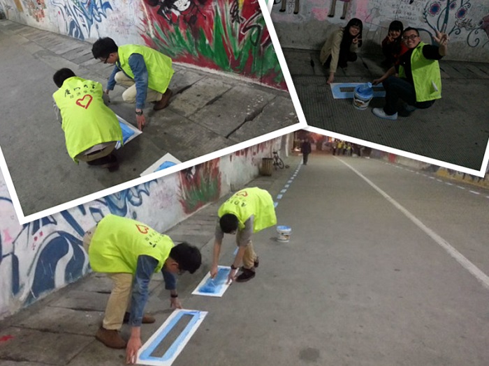 4月4日晚11点,告别白天的喧嚣,热闹的芙蓉隧道冷清下来,统一着装的经济学院志愿者便在这里开始了他们的工作,他们手持自制的模具,在地面上一遍又一遍的刷出一条条白色的线。经过3个小时的努力,将这些白线连接起来,便为芙蓉隧道增加了两条地面分界线,用来区分人行道和自行车道,提醒来往的师生遵守隧道通行秩序。是的,这就是经济学院芙蓉隧道“文明规范通行”志愿服务活动,也是继“文明规范停车”活动后,经院志愿者在校内将“口号宣传”转为“实际行动”的又一志愿活动。